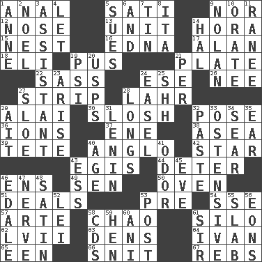 ACROSS 1. Of or related to the anus 5. Suttee (variant) 9. Not either 12. Olfactory organ 13. A single undivided whole 14. Israeli folk dance 15. A home for chicks 16. Pulitzer Prize-winning author Ferber 17. Actor Alda or Thicke 18. Biblical high priest 19. Fluid product of inflammation 21. Food holder 22. Backtalk 24. Compass dir. 26. Born 27. Long narrow piece of something 28. Cowardly lion portrayer 29. Jai _ 30. Agitate, as a liquid 32. Airs 36. Charged particles 37. Compass dir. 38. Toward the sea 39. False hair 40. White American of non-Hispanic descent 42. Play the lead 43. Armor plate that protects the chest 44. Prevent from occurring 46. Followers of ems 49. Elected rep. 50. Baking chamber 51. Allots cards 53. Before (prefix) 54. Compass dir. 57. Johnson of "Laugh-In" 58. US Secretary of Labor Elaine L. _ 61. Grain storage tower 62. 57 in ancient Rome 63. Lairs 64. "Terrible" tsar 65. Car or cant ending 66. In a ____ (agitated or irritated) 67. Confederate soldiers (slang) DOWN 1. Queen of England 1702-14 2. Christmas carol 3. Aide 4. Allow 5. Takes to court 6. Also 7. Metal container 8. Call ___ day 9. Pitcher Ryan 10. Declaim 11. Indian princess (variant) 14. Actor Linden 19. Air pressure measure (abbr.) 20. United States Postal Service (abbr.) 21. For each 23. Get up 24. Artist's stand 25. Quiet! 27. _ gin 28. Yearns 29. Small island 31. Soviet premier 1918-24 32. Thick mixture 33. Clearly or manifestly demonstrative 34. Burn superficially 35. Hearing organ 40. Mature 41. Aroma 43. Double-curved letter 45. First lady 46. Peak District village in England 47. Effrontery 48. Smooth fabric 52. Luau accessory 53. Mail 55. Thick slice 56. Immeasurably long periods of time 58. Music discs 59. Layer 60. Black tropical American cuckoo 61. Title for a knight