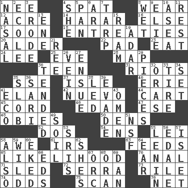 ACROSS 1. Born 4. Petty quarrel 8. Erode 12. Measure of real estate 14. Ethiopian city, capital of Harari 16. Otherwise 17. Within a short period 18. Pleas 20. Tree or shrub in the Birch family 22. Groovy apt. 23. Consume 24. Area sheltered from the wind 25. First lady 28. Atlas unit 30. Adolescent 31. Disturbances 35. Compass dir. 37. Capri or Wight 40. One of the Great Lakes 41. Flair 42. New (sp.) 44. Heavy open wagon 45. Drawstring 46. Dutch treat 47. Compass dir. 48. Off-Broadway awards 50. Habitations of wild animals 52. Two (Sp.) 54. Followers of ems 55. Luau accessory 58. Deep reverence 61. Big collection agency 63. Eats 65. Odds 70. Of or related to the anus 71. Downhill vehicle 72. Spanish missionary in California 73. Cause heat under the collar 74. Probability 75. Glance over 76. Remaining after all deductions DOWN 1. Rhinal 2. Learning spot: Fr. 3. Eat (away) 4. A female animal or person 5. Baking dish 6. Nonscientific branch of learning 7. Canvas cover 8. Soggy 9. Writer Wiesel 10. At sea 11. Take ten 13. Compass dir. 15. 480, 500 or 516 sheets of paper 19. The sixth month of the Jewish calendar 21. To separate or throw off 26. Distinctive style or manner 27. Take place subsequently 29. Parts 30. Looked after 32. Mouths or openings 33. Hoop that covers a wheel 34. Arrange properly for use 35. Messy guy 36. Indian skirt 38. Directed 39. Dodge 41. Environmental prefix 43. Sign of something about to happen 49. The visible part of the earth's surface 51. Overdraft (abbr.) 53. Indian titles of respect 55. Soviet premier 1918-24 56. Peak District village in England 57. Small island 58. In addition 59. Uncontrolled 60. Supplemented with great effort 62. "______ My Girl" (Turtles hit) 64. Hearing organ 66. Begley and Asner 67. The grampus (Milton) 68. Mouth or opening 69. Daniel's nick name