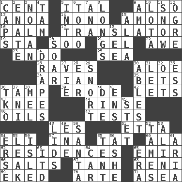 ACROSS 1. Penny 5. Slanted text style (abbr.) 9. In addition 13. Small Philippine buffalo 14. Words to Nanette 15. Amid 16. Inside of hand 17. Interpreter 19. R.R. building 20. "Barney Miller" actor Jack 21. Set 22. Deep reverence 23. Inside; within (prefix) 25. Ocean 26. All-night dance parties 30. _ vera 34. Believer in; advocate of (suffix) 35. Wagers 36. Pack (down) 39. Wear away 42. Allows 43. Leg joint 44. Remove soap 46. Petroleums 47. Trials 48. French article 51. Singer James 54. Connecticut Ivy Leaguer 57. _ tizzy (2 wds.) 58. Make lace 60. Wing 62. Dwellings 65. Independent ruler or chieftain 66. Table seasonings 67. Hyperbolic tangent 68. Painter Guido (1575-1642) 69. Made supply last 70. Johnson of "Laugh-In" 71. Toward the sea DOWN 1. Smile enhancers 2. Maternal 3. Pitcher Ryan 4. Scottish cap 5. To the inside or interior of 6. "Corrida" creature 7. Santa ___, CA 8. Yearns 9. Housemaid (var.) 10. Globular water bottle used in Asia 11. Frozen precipitation 12. Legendary monster 15. Silent film actress Nazimova 18. Perceive with the eye 20. Fly high 24. Window treatments 27. Compete 28. Ewer handle 29. Derisive sound 30. Most capable 31. Area sheltered from the wind 32. Baseball player Mel 33. Curvy letter 36. Ring climax 37. Black tropical American cuckoo 38. Cartoonist voice _ Blanc 40. Pass on 41. Followers of ems 45. Proofreading order 48. Flaplike coverings 49. Compass dir. 50. Before Barbara or Clara 52. Makes less strong or intense 53. Place in a line 54. Celtic language 55. Path through which fluid escapes 56. Small island 58. Portable shelter 59. American tennis player Robert 61. Roberta Peters solo 63. It would 64. 4-wheeled motor vehicle 65. Period
