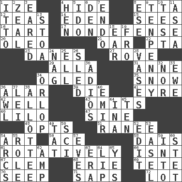 ACROSS 1. Ending with capital 4. Flintstone garb 8. Singer James 12. Afternoon social gatherings 14. Genesis locale 15. Perceives with the eye 16. Small pie 17. Unrelated to defense, as in spending 20. Butter sub 21. Rowing implement 22. Parent Teacher Assoc. 23. Natives or inhabitants of Denmark 27. Be footloose 29. Silent film actress Nazimova 31. Singer Murray 34. Stared 35. Frozen precipitation 36. Having or resembling wings 39. Expire 41. Jane of fiction 42. Water source 43. Leaves out 46. _ and Stitch 47. Trig term 48. Chooses 51. The wife of a rajah (variant) 54. Nonscientific branch of learning 56. Adept person 58. Raised platform 61. Happening in regular succession 66. Is not 67. Clement's nick name 68. 4th largest of the Great Lakes 69. Wig 70. Ooze 71. Plant excrements 72. Car dealer's back yard DOWN 1. "Tell ____ the Marines!" 2. Ardor 3. Having ears or earlike features 4. Layer 5. Wedding promise 6. Lair 7. Inside; within (prefix) 8. Compass dir. 9. 3-inch nail 10. Trial 11. Toward the sea 13. Portico 18. Ewer handle 19. Away 24. Tired old horse 25. Pipe bend 26. Downhill vehicle 28. Flower holders 30. Goodbye (Sp.) 32. And not 33. She-sheep 34. Fourth or lowest deck 36. Leather borer 37. Luau accessory 38. One to whom something is allotted 40. Independent ruler or chieftain 44. _ tizzy (2 wds.) 45. "___ Little Indians" 49. Make lace 50. _-fi 52. Prepare for publication 53. Artist's stand 54. Arches 55. Hero or heavy, e.g. 57. Nights before holidays 59. To the inside or interior of 60. Proofreading order 62. Electrical Unit 63. Epoch 64. Mouth edge 65. Affirmative reply
