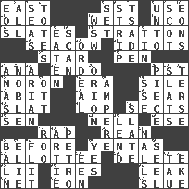 ACROSS 1. Compass direction 5. Fast jet (abbr.) 8. Purpose 11. Margarine 12. Moistens 13. Non-commissioned officer (abbr.) 14. Chalkboards 17. Ski resort town in Vermont 19. Manatee 21. Foolish or stupid persons 22. Play the lead 23. Writing instrument 24. Santa ___, CA 27. Inside; within (prefix) 29. Pacific Standard Time (abbr.) 32. Person of subnormal intelligence 34. Epoch 36. Drop; flow; fall 37. "This won't hurt ____!" 38. Direct toward a target or goal 39. Shrivel 40. Narrow board 41. Trim (branches) 42. Religious groups 43. Elected rep. 44. 1994 drama film starring Jodie Foster 46. Compass dir. 47. Reproach for some lapse or misdeed 50. 480, 500 or 516 sheets of paper 52. Prior to 55. Gossips 57. One to whom something is allotted 59. Keyboard key 62. Cards in a Roman deck? 63. Angers 64. Path through which fluid escapes 65. Was introduced to 66. Period of immesurable duration 67. Turn sharply DOWN 1. Greek goddess of the dawn 2. Everything 3. Oceans 4. Hauls 5. Arrange properly for use 6. Remove all contents or possession from 7. Sadhe (variant) 8. To (old English) 9. Native of Scotland 10. Immeasurably long periods of time 12. Compass dir. 15. Eroded 16. Examine minutely or intensely 18. Shallow baking pan 20. Severe or trying experience 24. Collect or gather 25. Impressive in appearance 26. Believer in; advocate of (suffix) 28. Constellation of myth 29. Component 30. Narrow boards 31. Laconic 33. Baseball player Mel 35. Electrical Unit 36. Compass dir. 42. Chalkboard 45. Grant temporary use of 47. Friend of Pooh 48. Nick name for Arthur 49. Stone: prefix 51. Promenades 52. Lip ointment 53. Writer Wiesel 54. Secret move to avoid paying debts 55. Consenting reply 56. Stitch closed the eyes of (a falcon) 58. Car or cant ending 60. The 19th letter of the Greek alphabet 61. Supplement with great effort