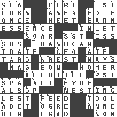 ACROSS 1. Ocean 4. Foregone conclusion 8. Eastern Standard Time (abbr.) 11. Tennis shots 13. Toward the sea 14. Singer Brickell 15. At one time in the past 16. Confront 17. Merit 18. Substance 21. An arm off of a larger body of water 22. Fly high 23. Fast jet (abbr.) 25. Curvy letter 26. Distress signal 29. File 13 32. Feeling or showing extreme anger 34. Corporate head (abbr.) 35. Had dinner 38. Pacific island yam 39. Take or capture by force 41. Negative votes 43. Tired old horse 44. A really long time 45. Home run 46. One to whom something is allotted 50. Air pressure measure (abbr.) 51. Health resort 54. The first octave above the treble staff 55. Jane of fiction 57. Columnist Joseph or Stewart 59. Nestling 63. For fear that 64. Nourish 67. Implement 68. Collude with 69. Legendary monster 70. Singer Murray 71. Lair 72. Mild oath 73. Male child DOWN 1. A type of plum 2. Immeasurably long periods of time 3. Lettered men learn these first 4. Device for capturing images 5. Compass dir. 6. To riddle 7. Make lace 8. Peak District village in England 9. Fathers 10. Portable shelters 12. Perceives with the eye 14. Car or cant ending 19. Observe 20. Automobile 21. Call ___ day 23. "______ My Girl" (Turtles hit) 24. Native of Scotland 26. Be seated 27. NW Algerian seaport 28. "Two Mules for Sister ____" 30. Odor 31. Billionth: prefix 33. Ancient Roman robe 36. Pack (down) 37. Sight organs 39. Water source 40. Carrot, for example 42. Indian title of respect (Mr.) 45. Possessive pronoun 47. Pet locale 48. Watched over 49. Sight organ 51. First course 52. Cadet 53. NE Netherlands city 56. Singer James 58. Baseball player Mel 60. Charged particles 61. Words to Nanette 62. Small, secluded valley 64. Enemy 65. Ovum 66. Epoch