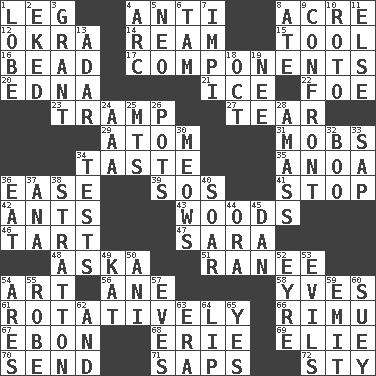 ACROSS 1. Part of a journey 4. Opposed to 8. 1/640 square mile 12. Gumbo ingredient 14. 480, 500 or 516 sheets of paper 15. Implement 16. Necklace unit 17. Parts 20. Pulitzer Prize-winning author Ferber 21. Frozen water 22. Enemy 23. _____ steamer (cargo ship) 27. Separate forcefully 29. Tiny particle 31. Crowds into 34. Clothes sense 35. Small Philippine buffalo 36. Relaxation 39. Mayday 41. Constrict 42. Pismires 43. Forest 46. Small pie 47. "Two Mules for Sister ____" 48. "____ silly question..." 51. The wife of a rajah (variant) 54. Tate display 56. A saturated hydrocarbon 58. Jacques Cousteau's middle name 61. Producing rotation 66. Tall New Zealand timber tree 67. Inky black, to poets 68. One of the Great Lakes 69. Writer Wiesel 70. Post 71. Plant excrements 72. Filthy place DOWN 1. Ear part 2. Made supply last 3. Monetary aid 4. Curve 5. Modern: prefix 6. Scottish cap 7. Body of Kaffir warriors 8. Had dinner 9. Meet 10. Printing process, for short 11. Otherwise 13. The sixth month of the Jewish calendar 18. Sep. follower 19. Born 24. American Automobile Association (abbr.) 25. Mountains (abbr.) 26. Cooking vessels 28. Collect or gather 30. Catcalls? 32. Oct. 31 cry 33. Plant excrement 34. Trials 36. Consume 37. Santa ___, CA 38. Ski resort town in Vermont 40. Fly high 44. Mouth or opening 45. One of the 12 tribes of Israel 49. Krazy ___ of comics 50. Black tropical American cuckoo 52. Jane of fiction 53. Vices 54. Ancient Greek god of war 55. Loose flowing garment 57. Nights before holidays 59. Send forth 60. Chop _ 62. Also 63. Period 64. Mouth edge 65. It is so