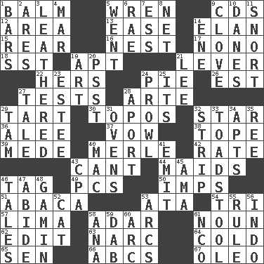 ACROSS 1. Lip ointment 5. Songbird 9. Music discs 12. Type of rug 13. Comfort 14. Style 15. Located in or toward the back 16. Egg locale 17. Words to Nanette 18. Fast jet (abbr.) 19. Fitting 21. Crowbar 22. Possessive pronoun 24. Sliced dessert 26. Eastern Standard Time (abbr.) 27. Trials 28. Johnson of "Laugh-In" 29. Small pie 30. Traditional theme or motif 32. Play the lead 36. Toward shelter 37. Solemn pledge 38. Drink excessively 39. Ancient Persian 40. Haggard of country music 42. Pace 43. Patter 44. Women servants 46. Label 49. Personal Computers (abbr.) 50. Naughty children 51. Phillipine bananalike plant 53. _ moment's notice (2 wds.) 54. Three (prefix) 57. Pale green bean 58. The sixth month of the Jewish calendar 61. Part of speech 62. Prepare for publication 63. Drug cop 64. Lacking warmth 65. Elected rep. 66. Lettered men learn these first 67. Margarine DOWN 1. Soap units 2. Ancient Greek god of war 3. Tough but pliablecoriaceous 4. Spoil 5. Gone 6. Actress Charlotte 7. Double-curved letter 8. Fish or hair follower 9. Garlic unit 10. Natives or inhabitants of Denmark 11. Derisive sound 14. Compass dir. 19. Tate display 20. Inconspicuous attention getter 21. Area sheltered from the wind 23. First name in cosmetics 24. Move like a hungry wolf 25. It is 27. Falsehood 28. To the left, to Queeg 29. Scottish cap 31. Baking chambers 32. Long narrow piece of something 33. Inedible or poisonous agaric 34. Flats, for short 35. To riddle 40. Apple computer (short form) 41. Send forth 43. Numbers guy (abbr.) 45. Nursemaid (var.) 46. Stories 47. Stay 48. Homeless child 52. Feline 53. Curves 55. Court order 56. _ china 58. Santa ___, CA 59. Small moist lump or mass 60. Curve 61. Non-commissioned officer (abbr.)