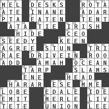 ACROSS 1. Cartoonist voice _ Blanc 4. Writing tables 9. Round or rotation of duties 13. Had dinner 14. Silly 15. The sixth month of the Jewish calendar 16. Parent Teacher Assoc. 17. Eroded 18. Portable shelter 19. _ moment's notice (2 wds.) 21. Neckwear 22. From or relating to Ireland 24. Flintstone garb 26. Corporate head (abbr.) 27. Shabby and untidy 29. Peachy ____! 30. Match 31. Make senseless or dizzy 33. Three (prefix) 36. Actress Charlotte 37. Popular '50s hangout 40. Friend of Pooh 41. Increase 42. Nursemaid 43. Sea 45. Canvas cover 47. Criticizes harshly 48. Compass dir. 49. Froth on beer 50. Ethiopian city, capital of Harari 52. Compass dir. 54. Madame (abbr.) 56. Ear part 57. Peak District village in England 59. Binary compound 61. Send forth 62. Haggard of country music 63. 54 in ancient Rome 64. Wig 65. The state of being joined or united 66. Area sheltered from the wind DOWN 1. Atlas unit 2. Singer James 3. Resembling or made to resemble leather 4. Pass on 5. Related on the mother's side 6. Suttee (variant) 7. Leg joint 8. Elected rep. 9. Food allowance for one day 10. Lyric poems 11. Hyperbolic tangent 12. Tate display 20. Helper 22. Ancient Celtic tribe of eastern Britain 23. To separate or throw off 25. Colored 27. "Two Mules for Sister ____" 28. Mild oath 29. Malaysian steamed pastry 31. Simple or foolish person 32. Federal power corp. 33. Excercise machine 34. Wander 35. Charged atoms 38. More valued for its uncommonness 39. Sense of smell 44. Burrowing marine mollusk 45. Cigar-shaped 46. Santa ___, CA 49. Phone greeting 50. Residence 51. "This won't hurt ____!" 52. Paradise 53. Indian skirt 55. Singer Brickell 56. Allow 57. Australian flightless bird 58. Car or cant ending 60. Night before a holiday