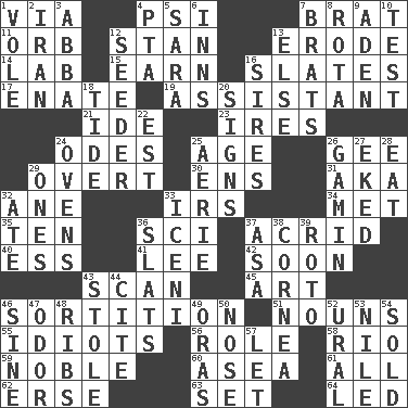 ACROSS 1. By way of 4. Air pressure measure (abbr.) 7. Naughty child 11. Globe 12. Comedian Laurel of Laurel & Hardy 13. Wear away 14. Experiment locale 15. Merit 16. Chalkboards 17. Related on the mother's side 19. Helper 21. Binary compound 23. Angers 24. Lyric poems 25. Personal question 26. Unit of force equal to gravity 29. Unconcealed 30. Followers of ems 31. Alias (abbr.) 32. One (Scot) 33. Big collection agency 34. Was introduced to 35. "___ Little Indians" 36. _-fi 37. Bitter 40. Curvy letter 41. Area sheltered from the wind 42. Within a short period 43. Glance over 45. Tate display 46. Decision 51. Parts of speech 55. Foolish or stupid persons 56. Hero or heavy, e.g. 58. River (Sp.) 59. Impressive in appearance 60. At sea 61. Everything 62. Celtic language 63. Put into a specified state 64. Directed DOWN 1. Short-tailed, large-bodied rat 2. SW Asia republic 3. Swedish rock group 4. Parent Teacher Assoc. 5. "Two Mules for Sister ____" 6. Taverns 7. Naughty children 8. Round or rotation of duties 9. Arabian gulf 10. Trial 12. Sowing specialist 13. Otherwise 16. Male parents of animals 18. Periodic rise and fall of the sea level 20. Attaches a signature 22. Eastern Standard Time (abbr.) 24. Baking chambers 25. Nest on high 26. Homeless child 27. Made supply last 28. Consume 29. Singles 32. Had dinner 33. Ancient Celtic tribe of eastern Britain 36. Narrow boards 37. White ___ sheet 38. Pupil covering 39. Printing process, for short 43. Fur scarf 44. Quote 46. Trig term 47. Aroma 48. Chest bones 49. Mouths or openings 50. Sense of smell 52. Mountain range 53. Mediterranean tributary 54. Exchanged or delivered for money 57. Allow