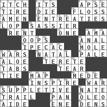 ACROSS 1. Hankering 5. It is 8. Domed church section 12. Become fatigued 13. Expire 14. Soft thread for cleaning between teeth 15. So be it 16. Pleas 19. Trim (branches) 20. More impudent 21. Monthly bill 23. Single 24. Wet nurse (var.) 27. I made a mistake 30. Of or related to the anus 31. Medicinal drug used to evoke vomiting 34. Undercover agent 35. Armed conflicts 38. Relating to or accompanying birth 40. Light colored 41. Medicinal plant 42. Cigar-shaped 44. Bar bills 45. Separate forcefully 46. Standoff 47. Atlas unit 50. Ancient Persian 53. Motivate 57. Armed conflict 59. Supplying deficiencies 63. Nathan's nickname 64. Get behind 65. Baking dish 66. Butter sub 67. Helper 68. Compass dir. 69. Lairs DOWN 1. Slanted text style (abbr.) 2. Southeast Indonesia island 3. Streamer paper 4. Layer 5. It may be bright or harebrained 6. Metal containers 7. Puts into a specified state 8. Keyboard modifier key 9. Luau course 10. Compass dir. 11. Curvy letter 14. Conductor's collection 17. River (Sp.) 18. Car or cant ending 20. Obstruct or block passage 22. Annoying sounds 24. Small Philippine buffalo 25. Promenade 26. Toward shelter 28. Animal enclosure 29. Jazz singing style 30. Electrical Unit 32. Had dinner 33. Haul 35. Electrical Unit 36. Jai _ 37. Loose flowing garment 39. Area sheltered from the wind 43. Not wild 47. Place where flour is made 48. One (Scot) 49. Pacific Standard Time (abbr.) 51. A sleeping potion; an opiate (poet.) 52. Ingested 54. Corncob 55. _ the terrible 56. French philosopher Descartes 58. Vintage cars 59. R.R. building 60. RI univ. 61. Writing tablet 62. Sliced dessert 63. Lower and raise head in agreement