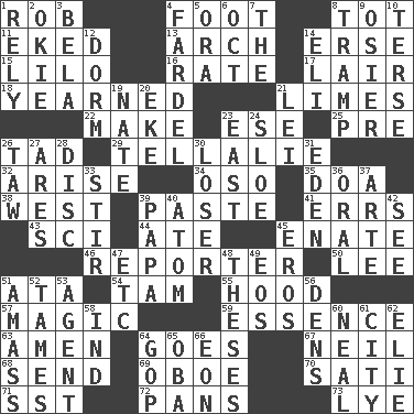 ACROSS 1. Director Reiner 4. One third of a yard 8. Small child 11. Supplemented with great effort 13. Bowlike part 14. Celtic language 15. _ and Stitch 16. Assign a rank or rating to 17. Den 18. Felt deep pity or tenderness 21. Citrus fruits 22. Create 23. Compass dir. 25. Before (prefix) 26. Bit 29. Copy Pinocchio 32. Originate 34. Bear (Spanish) 35. ___ good deed 38. Compass direction 39. Thick mixture 41. Blunders 43. _-fi 44. Had dinner 45. Related on the mother's side 46. News announcer 50. Area sheltered from the wind 51. _ moment's notice (2 wds.) 54. Scottish cap 55. Parka part 57. Mysterious quality of enchantment 59. Center 63. So be it 64. Travels 67. Famous astronaut Armstrong 68. Post 69. Mitch Miller's instrument 70. Suttee (variant) 71. Fast jet (abbr.) 72. Baking dishes 73. Potassium hydroxide DOWN 1. Have trust in 2. Migrant worker of the '30s 3. Actor Lugosi 4. Bundle 5. Mouth or opening 6. Sep. follower 7. Definite Article 8. _____ steamer (cargo ship) 9. Flexible twig of a willow tree 10. Laconic 12. Dormintory (informal) 14. Biblical high priest 19. Nathan's nickname 20. Make supply last 21. Flowery wreath 23. Compass direction 24. A type of plum 26. The 23rd letter of the Hebrew alphabet 27. Ancient Greek god of war 28. Compact _ 30. Failure 31. Genesis locale 33. Commotion 36. Spoken 37. Johnson of "Laugh-In" 39. Dad 40. Tiny particle 42. Perceive with the eye 45. Greek god of love 47. And so on (abbr.) 48. College papers 49. Greek goddess of the dawn 51. Collect or gather 52. Makes less strong or intense 53. Rep 56. Lairs 58. Working for oneself (abbr.) 60. Anneal 61. Municipality 62. Writer Wiesel 64. Grand Old Party 65. Chief or king in Benin or Nigeria 66. Period of immesurable duration