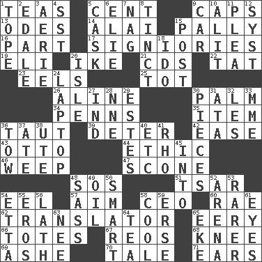 ACROSS 1. Beverages made from leaves 5. Penny 9. Smile enhancers 13. Lyric poems 14. Jai ____ 15. Friendly 16. Component 17. Seigniories (variant) 19. Connecticut Ivy Leaguer 20. Mamie's mate 21. Music discs 22. Make lace 23. Snakelike fish 25. Small child 26. Place in a line 30. Inside of hand 34. Actor Sean's family 35. A distinct part 36. Tense 39. Prevent from occurring 42. Comfort 43. Von Bismarck 44. Moral principle 46. Shed a tear 47. Biscuitlike quick bread 48. Distress signal 51. Russian ruler of old 54. Snakelike fish 57. Direct toward a target or goal 58. Corporate head (abbr.) 60. Actress Charlotte 62. Interpreter 65. Suggestive of the supernatural 66. Hauls 67. Vintage cars 68. Leg joint 69. American tennis player Robert 70. Lie 71. Hearing organs DOWN 1. Drink excessively 2. Peak District village in England 3. Nest on high 4. Fast jet (abbr.) 5. Keg 6. Writer Wiesel 7. Tired old horse 8. A color or tint 9. Automobile 10. Came down and settled, as after flight 11. Entreaty 12. System (abbr.) 15. Mail 18. Wedding promise 20. Small island 24. Portable computer 27. Indiana (abbr.) 28. Compass dir. 29. _____ Park, CO 30. Components 31. _ moment's notice (2 wds.) 32. French article 33. Madame (abbr.) 36. Pull behind 37. Had dinner 38. Shoshoni 40. And so on (abbr.) 41. 17th letter of the Greek alphabet 45. To the inside or interior of 48. Backtalk 49. Lubricate 50. Don Adams' spy role 52. Sports stadium 53. Less widely known 54. Singer James 55. Greek god of love 56. Thin strip of wood or metal 58. Calm and collected 59. Celtic language 61. Sight organs 63. Born 64. Afternoon social gathering 65. Supplement with great effort