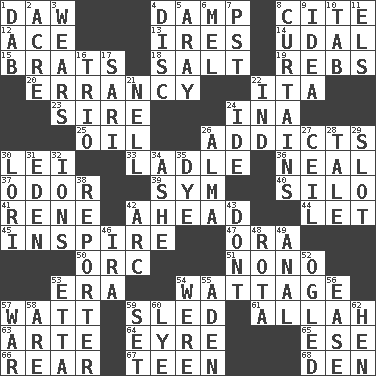 ACROSS 1. Obsolete 4. Moist 8. Quote 12. Adept person 13. Angers 14. Freehold land 15. Naughty children 18. Table seasoning 19. Confederate soldiers (slang) 20. Tendancy to err 22. Call ___ day 23. The founder of a family 24. _ tizzy (2 wds.) 25. Lubricate 26. Inveterate users 30. Flowery wreath 33. Dipping utensil 36. Anneal 37. Aroma 39. Symbol (abbr.) 40. Grain storage tower 41. French philosopher Descartes 42. Forward in time 44. Allow 45. Heighten or intensify 47. Mouth or opening 50. The grampus (Milton) 51. Words to Nanette 53. Period 54. Electrical Measurement 57. Electrical Unit 59. Downhill vehicle 61. Assad's deity 63. Johnson of "Laugh-In" 64. Jane of fiction 65. Compass dir. 66. Located in or toward the back 67. Adolescent 68. Lair DOWN 1. Pat or tap gently 2. 1/640 square mile 3. Puts on (as clothing) 4. Plate 5. Like ___ of sunshine 6. Cartoonist voice _ Blanc 7. Pacific Standard Time (abbr.) 8. Window treatments 9. The content of cognition 10. Keyboard key 11. Raised railways 16. Musical group of three 17. Indian skirt 21. 1994 drama film starring Jodie Foster 22. Indiana (abbr.) 24. Binary compound 26. _ mater 27. To provide with a ceiling 28. Story 29. Narrow, elongated depression 30. Australian parrot (variant) 31. Locale of original sin 32. Charged atoms 34. American tennis player Robert 35. Color 38. News announcer 42. Curve 43. Do not 46. Retirement account (abbr.) 48. Roll call or roster of names 49. Of or related to the anus 52. Stared 53. Singer James 54. We are 55. An important port of Yemen 56. Relaxation 57. Armed conflict 58. "We ___ not amused" (Victoria) 59. Put into a specified state 60. Potassium hydroxide 62. Layer
