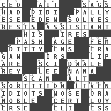 ACROSS 1. Corporate head (abbr.) 4. Small island 7. Sinks 11. Possessed 12. "You Light Up My Life" star Conn 13. Friendly 14. Compass dir. 15. Genesis locale 16. Finds the solution 17. Musical pauses 19. Helper 21. Part of HMS, perhaps 23. Angers 24. Romantic infatuation 25. Mature 26. Opposite of masc. 29. Simple song 30. Followers of ems 31. Epoch 32. Separate the seeds from cotton 33. Big collection agency 34. Mouth edge 35. "We ___ not amused" (Victoria) 36. _-fi 37. A sleeping potion; an opiate (poet.) 40. Marina Del _, California 41. Area sheltered from the wind 42. Nanny 43. Skim 45. Keyboard modifier key 46. Decision 51. Make or become more lively 55. Foolish or stupid persons 56. Characteristic smell of wine 58. Mouth or opening 59. Impressive in appearance 60. Sure thing 61. Myrna of the movies 62. Celtic language 63. Connecticut Ivy Leaguer 64. Curvy letter DOWN 1. "Mermaids" star 2. Comfort 3. Lyric poems 4. Assist 5. The content of cognition 6. Airtight sealed metal containers 7. Table seasonings 8. Inventor's middle name 9. Small, secluded valley 10. System (abbr.) 12. Cease 13. Airs 16. Founders of families 18. Not this but _ 20. Omens 22. Like a shrinking violet 24. Abounding in pines 25. Nest on high 26. Man or boy (slang) 27. One of the Great Lakes 28. Atlas unit 29. Have the gumption 32. Slender fish 33. Ancient Celtic tribe of eastern Britain 36. Narrow boards 37. Heredity factor (abbr.) 38. Place for singles 39. Against 43. Took without asking 44. Quote 46. Trig term 47. Aroma 48. Teases 49. At one time in the past 50. Christmas carol 52. Grand slam 53. Greek god of love 54. Negative votes 57. _ Lanka