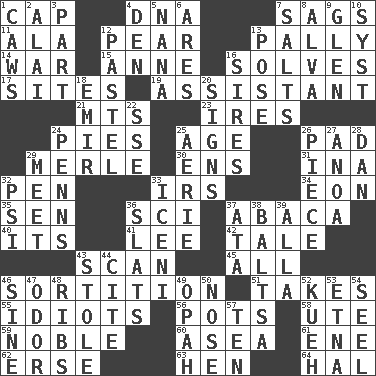 ACROSS 1. Head covering 4. Heredity factor (abbr.) 7. Sinks 11. Wing 12. Lightbulb-shaped fruit 13. Friendly 14. Armed conflict 15. Singer Murray 16. Finds the solution 17. Locates 19. Aide 21. Mountains (abbr.) 23. Angers 24. Sliced desserts 25. Grow older 26. Groovy apt. 29. Haggard of country music 30. Followers of ems 31. _ tizzy (2 wds.) 32. Writing instrument 33. Big collection agency 34. A really long time 35. Elected rep. 36. _-fi 37. Phillipine bananalike plant 40. It is 41. Area sheltered from the wind 42. Falsehood 43. Examine hastily 45. 100% 46. Conclusion 51. Proceeds 55. Foolish or stupid persons 56. Cooking vessels 58. Shoshoni 59. Impressive in appearance 60. Toward the sea 61. Compass dir. 62. Celtic language 63. Layer 64. Actor Linden DOWN 1. Crow sounds 2. Jai _ 3. Piece 4. Lair 5. Nanny 6. Ancient Greek god of war 7. Table seasonings 8. Inventor's middle name 9. Small, secluded valley 10. System (abbr.) 12. Soft color 13. Introduce or present, as a question 16. Fathers 18. Independent ruler or chieftain 20. Attaches a signature 22. Compass dir. 24. Actor Sean's family 25. Nest on high 26. Part 27. Small Philippine buffalo 28. Daniel's nick name 29. Rendezvous 32. 23rd letter of the Greek alphabet 33. Ancient Celtic tribe of eastern Britain 36. Narrow boards 37. _ moment's notice (2 wds.) 38. Greek mezzo-soprano Agnes 39. Silent film actress Nazimova 43. Took without asking 44. Quote 46. Trig term 47. Aroma 48. Chest bones 49. Brightly colored fish 50. Sense of smell 52. Malaysian steamed pastry 53. Inactive volcano in Sicily 54. Stitch closed the eyes of (a falcon) 57. Nine, plus one