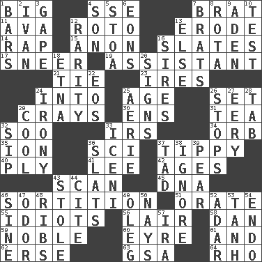 ACROSS 1. Massive 4. Compass dir. 7. Naughty child 11. Actress Gardner 12. Printing process, for short 13. Eat (away) 14. Hit sharply and swiftly 15. At once, immediately (arch.) 16. Chalkboards 17. Contemptuous expression 19. Helper 21. Neckwear 23. Angers 24. To the inside or interior of 25. Ripen 26. Put into a specified state 29. Trading vessels 30. Followers of ems 31. Afternoon social gathering 32. "Barney Miller" actor Jack 33. Big collection agency 34. Globe 35. Electrically charged atom 36. _-fi 37. Likely to tip or tilt 40. Strand of rope, yarn or thread 41. Area sheltered from the wind 42. Eras 43. Examine minutely or intensely 45. Heredity factor (abbr.) 46. Determination 51. Speak pompously 55. Foolish or stupid persons 56. Den 58. One of the 12 tribes of Israel 59. Impressive in appearance 60. Jane of fiction 61. Added to 62. Celtic language 63. Girls' org. (abbr.) 64. 17th letter of the Greek alphabet DOWN 1. Oblong pieces of solid material 2. _ the terrible 3. Yawn 4. Male offspring 5. Portico 6. Immeasurably long periods of time 7. Naughty children 8. Roll call or roster of names 9. Arabian gulf 10. Trial 12. Noteworthy scarcity 13. Otherwise 16. Titles for men of rank and authority 18. Inactive volcano in Sicily 20. Omens 22. Greek goddess of the dawn 24. Literary sarcasm 25. Nest on high 26. Ceases 27. Suggestive of the supernatural 28. Bar bill 29. Calm and collected 32. Small drink 33. Ancient Celtic tribe of eastern Britain 36. Narrow boards 37. Bit 38. Disregard 39. Lightbulb-shaped fruit 43. Took without asking 44. Quote 46. Trig term 47. Aroma 48. Chest bones 49. Cassini of fashion 50. Negative votes 52. The sixth month of the Jewish calendar 53. Hyperbolic tangent 54. Inside; within (prefix) 57. Retirement account (abbr.)