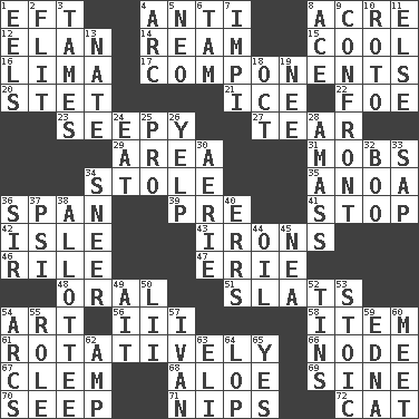 ACROSS 1. Newt 4. Against 8. Measure of real estate 12. Enthusiasm 14. 480, 500 or 516 sheets of paper 15. Calm and collected 16. Pale green bean 17. Parts 20. Proofreading order 21. Frozen water 22. Enemy 23. Oozy 27. Pull apart 29. Type of rug 31. Disorderly crowds 34. Took without asking 35. Small Philippine buffalo 36. Connect, as a bridge 39. Before (prefix) 41. Obstruct or block passage 42. Capri or Wight 43. Removes the wrinkles 46. Cause heat under the collar 47. One of the Great Lakes 48. Spoken 51. Narrow boards 54. Nonscientific branch of learning 56. One more than two 58. A whole individual unit 61. Producing rotation 66. Thickened enlargement 67. Clement's nick name 68. _ vera 69. Trig term 70. Ooze 71. Pinches, bites 72. Domesticated feline DOWN 1. Snakelike fish 2. Sudden quick movement 3. Makes less strong or intense 4. Curve 5. Modern: prefix 6. Scottish cap 7. Body of Kaffir warriors 8. Adept person 9. Meet 10. Printing process, for short 11. Otherwise 13. Nathan's nickname 18. Sep. follower 19. Born 24. Consume 25. Adept person 26. Sharp bark 28. Collect or gather 30. Nest on high 32. Oct. 31 cry 33. Plant excrement 34. Contemptuous expression 36. Title for a knight 37. 23rd letter of the Greek alphabet 38. One to whom something is allotted 40. Blunders 44. Petroleum 45. Teachers' org. 49. Small island 50. Cards in a Roman deck? 52. Airtight sealed metal containers 53. Unemotional 54. Arches 55. Hero or heavy, e.g. 57. _ the terrible 59. Pulitzer Prize-winning author Ferber 60. Confront 62. Electrical Unit 63. Biblical high priest 64. Trim (branches) 65. Affirmative reply
