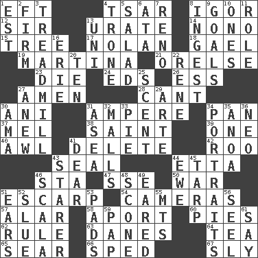 ACROSS 1. Newt 4. Russian ruler of old 8. Russian composer Stravinsky 12. Title for a knight 13. A salt of uric acid 14. Words to Nanette 15. Family _ (genealogy) 17. Pitcher Ryan 18. Highlander 19. Chrissie's court nemesis 21. Threatening words 23. Expire 24. Begley and Asner 26. Curvy letter 27. So be it 28. Patter 30. Black tropical American cuckoo 31. Electrical Unit 34. Baking dish 37. Cartoonist voice _ Blanc 38. Inhabitant of Heaven 39. Single 40. Leather borer 41. Keyboard key 42. Friend of Pooh 43. Lick closed 44. Singer James 46. R.R. building 47. Compass dir. 50. Armed conflict 51. Fortification 54. Devices for capturing images 57. Having or resembling wings 58. To the left, to Queeg 60. Sliced desserts 62. General guideline 63. Natives or inhabitants of Denmark 64. Beverage made from leaves 65. Burn superficially 66. Moved rapidly 67. Wily DOWN 1. Eastern Standard Time (abbr.) 2. Unshakable 3. Excercise machine 4. Marketplace scale 5. Vegetable dish 6. _ moment's notice (2 wds.) 7. Former U.S. Attorney General Janet 8. Eat 9. Scores awarded for successful feats 10. Washington bills 11. Hero or heavy, e.g. 13. Single; one (prefix) 16. 4th largest of the Great Lakes 20. "___ Little Indians" 22. French philosopher Descartes 25. Aroma 27. Afresh 29. Johnson of "Laugh-In" 30. Nanny (var.) 31. At sea 32. Promenades 33. Sliced dessert 34. Likenesses of persons 35. Small Philippine buffalo 36. Modern: prefix 41. Letter starter 43. A viewer who gazes fixedly 44. She-sheep 45. Canvas cover 46. Any of the three canals of the cochlea 48. Biscuitlike quick bread 49. Having ears or earlike features 51. Hearing organs 52. Change direction abruptly 53. Writing tablets 55. Mountains (abbr.) 56. Stitch closed the eyes of (a falcon) 59. Infant food 61. Declare
