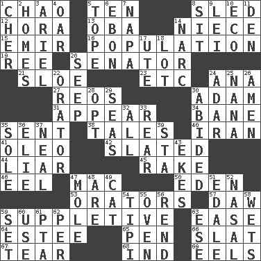 ACROSS 1. US Secretary of Labor Elaine L. _ 5. "___ Little Indians" 8. Downhill vehicle 12. Israeli folk dance 13. Chief or king in Benin or Nigeria 14. Sibling's daughter 15. Independent ruler or chieftain 16. Census information 19. To separate or throw off 20. Legislator 21. A type of plum 23. And so on (abbr.) 24. Santa ___, CA 27. Vintage cars 30. First of billions? 31. Seem 34. Object of repulsion 35. Emitted 38. Lies 40. SW Asia republic 41. Butter sub 42. Scheduled 44. One who doesn't tell the truth 45. Libertine 46. Snakelike fish 47. Big _ 50. Paradise 53. Speakers 57. Fool 59. Supplying deficiencies 63. Relaxation 64. First name in cosmetics 65. Fenced enclosure 66. Narrow board 67. Lacerate 68. Indiana (abbr.) 69. Snakelike fish DOWN 1. "Mermaids" star 2. Dwellings 3. Satellite of Uranus 4. Boat paddle 5. Drink excessively 6. Inky black, to poets 7. California wine valley 8. Be seated 9. Luau accessory 10. Environmental prefix 11. Lair 14. Drug cop 17. Shoshoni 18. Car dealer's back yard 20. Ooze 22. Speaker 24. The sixth month of the Jewish calendar 25. Nanny 26. So be it 28. Elect 29. Oceans 30. Tolerated 32. 100% 33. Tail end 35. Flatfish 36. Writer Wiesel 37. Actress Patricia 39. R.R. building 43. Makes supply last 47. Undercover agent 48. "We ___ not amused" (Victoria) 49. Feline 51. Peak District village in England 52. Rhinal 54. Native american tent (variation) 55. Baking chamber 56. Tear apart 58. Moistens 59. Put into a specified state 60. Purpose 61. Parent Teacher Association (abbr.) 62. For each 63. Compass dir.