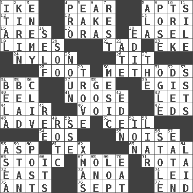 ACROSS 1. Mamie's husband 4. Lightbulb-shaped fruit 8. Flats, for short 12. Metal container 13. Libertine 14. Australian parrot (variant) 15. Ancient Greek god of war 17. Mouths or openings 18. Artist's stand 19. Citrus fruits 21. Small boy 23. Supplement with great effort 24. Thermoplastic polyamide 26. Teat (slang) 28. 12 inches 30. Modes 34. English channel? 37. Goad 39. The front part of a cuirass 40. Snakelike fish 41. Trap for birds or small mammals 43. Allow 44. Den 46. Null 47. Begley and Asner 48. Contrary to your interests or welfare 51. To provide with a ceiling 54. Greek goddess of the dawn 55. Annoying sound 58. Cleo's killer 61. John Ritter's dad 63. Brizilian seaport 65. Unemotional 67. Undercover agent 71. Round or rotation of duties 72. 90 degrees 73. Small Philippine buffalo 74. Luau accessory 75. Pismires 76. Back-to-school mo. 77. Conclusion DOWN 1. Slanted text style (abbr.) 2. Japanese brewing company 3. Foe 4. Adept person 5. Ewer handle 6. Alias (abbr.) 7. Take ten 8. Chicken ___ king 9. Introduce or present, as a question 10. Long journey 11. Filth; sediment 16. Automatic 18. Prepare for publication 20. "Barney Miller" actor Jack 22. Had dinner 25. Part of speech 27. Definite Article 29. Collection of objects 30. Mesonic 31. Stare 32. Passed on 33. Fast planes 34. Actor Lugosi 35. Necklace unit 36. 154 in Roman numerals 38. Thick or sticky substance 42. Genesis locale 45. Portuguese money of account (variant) 49. College mil. group 50. Compass dir. 52. Electrically charged atom 53. One who doesn't tell the truth 56. Fur scarf 57. Ingested 58. At sea 59. Comedian Laurel of Laurel & Hardy 60. Mail 62. Dec. holiday 64. Put down 66. ___ a Wonderful Life 68. Single 69. Trim (branches) 70. Consume