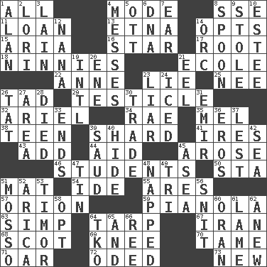 ACROSS 1. Everything 4. Method 8. Compass dir. 11. Grant temporary use of 13. Inactive volcano in Sicily 14. Chooses 15. Roberta Peters solo 16. Play the lead 17. Carrot, for example 18. Fools 21. Learning spot: Fr. 22. Queen of England 1702-14 23. Whopper 25. Born 26. Bit 29. One of the two male reproductive glands 32. Satellite of Uranus 34. Actress Charlotte 35. Cartoonist voice _ Blanc 38. Adolescent 39. Broken piece 41. Angers 43. Increase 44. Assist 45. Came up 46. SAT takers 50. R.R. building 51. Floor covering 54. Binary compound 55. Ancient Greek god of war 57. Constellation of myth 59. Player piano 63. Simple or foolish person 64. Canvas cover 67. SW Asia republic 68. Highlander 69. Leg joint 70. Not wild 71. Rowing implement 72. Wrote a lyric poem 73. ___ Haven, CT DOWN 1. Actor Alda or Thicke 2. Australian parrot (variant) 3. (Had) reclined 4. Makes clutter 5. Baseball player Mel 6. Heredity factor (abbr.) 7. Ewer handle 8. Soup utensil 9. Fur scarf 10. First name in cosmetics 12. Grandmother 14. The grampus (Milton) 19. International (abbr.) 20. Compass dir. 21. Snakelike fish 23. One who doesn't tell the truth 24. On the rocks 26. Make lace 27. Type of rug 28. Passed on 30. Buy and sell 31. Independent ruler or chieftain 33. Conclusions 36. Greek god of love 37. For fear that 39. Saudi Arabian king (1953-1964) 40. Flintstone garb 42. Ocean 45. At sea 47. Metal container 48. Slept 49. Three (prefix) 51. With motion or animation 52. N. Chile seaport 53. The easternmost of the Lesser Sundas 56. In a ____ (agitated or irritated) 58. Choose 60. NW Algerian seaport 61. Unable to walk 62. Afresh 64. Ring climax 65. Plus 66. Portuguese money of account (variant)