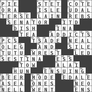 ACROSS 1. Sliced dessert 4. Proofreading order 8. ____ d'Azur (French Riviera) 12. Mouth or opening 13. Small island 14. Hereditary estate 15. Laconic 18. (Had) reclined 19. Confederate soldiers (slang) 20. Legislator 22. It would 23. Food container 24. _ tizzy (2 wds.) 25. Afternoon social gathering 26. Inveterate users 30. Personal Computers (abbr.) 33. Sadhe (variant) 36. Actress Patricia 37. Cassini of fashion 39. Added to 40. Filth; sediment 41. Ballerina skirt 42. Take or capture by force 44. Directed 45. French poetic form 47. Curvy letter 50. Pull behind 51. Jai ____ 53. Attila the _ 54. Following as a consequence or result 57. Fermented drink made from hops 59. Method 61. Peak District village in England 63. Toward the sea 64. Singles 65. Modern: prefix 66. 1994 drama film starring Jodie Foster 67. Left 68. Followers of ems DOWN 1. Cooking vessel 2. Angers 3. Having ears or earlike features 4. Grain storage tower 5. Russian ruler of old 6. Biblical high priest 7. Nine, plus one 8. Window treatments 9. Wrote a lyric poem 10. Bar bill 11. Raised railways 16. In a ____ (agitated or irritated) 17. Relaxation 21. Not this but _ 22. Indiana (abbr.) 24. Binary compound 26. Sums up 27. To provide with a ceiling 28. Lie 29. Downhill vehicle 30. Cooking vessels 31. A slight indication 32. Puts into a specified state 34. "Two Mules for Sister ____" 35. One (Scot) 38. From the throat 42. Compass dir. 43. Afternoon social gatherings 46. Electrically charged atom 48. Turn sharply 49. Alleged 52. Silly 53. Person who is morally reprehensible 54. Paradise 55. A home for chicks 56. Small, secluded valley 57. Forbid 58. Compass dir. 59. Cut the grass 60. Single 62. Greek goddess of the dawn