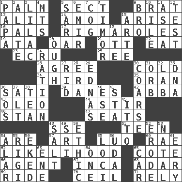 ACROSS 1. Inside of hand 5. Religious group 9. Naughty child 13. Came down and settled, as after flight 14. Mine, in Marseilles 15. Get up 16. Friends 17. Complicated, petty procedures 19. _ moment's notice (2 wds.) 20. Rowing implement 21. Baseball player Mel 22. Consume 23. Shade of tan 25. To riddle 26. Match 30. Having a low temperature 34. One of three equal parts 35. Northwest Algerian city 36. Suttee (variant) 39. Natives or inhabitants of Denmark 42. Swedish rock group 43. Butter sub 44. Moving or stirring 46. Comedian Laurel of Laurel & Hardy 47. Theater features 48. Compass dir. 51. Adolescent 54. "We ___ not amused" (Victoria) 57. Tate display 58. Nilotic language 60. Actress Charlotte 62. Probability 65. ____ d'Azur (French Riviera) 66. Rep 67. South American Indian 68. The sixth month of the Jewish calendar 69. Travel on or in a vehicle 70. To provide with a ceiling 71. Trust DOWN 1. Dad 2. Having winglike extensions 3. Pale purple color 4. Mountains (abbr.) 5. "Two Mules for Sister ____" 6. Arab leader 7. Gear tooth 8. The easternmost of the Lesser Sundas 9. Sis' sibling 10. Cause heat under the collar 11. At sea 12. Trial 15. Johnson of "Laugh-In" 18. Had dinner 20. Ending for "Through" and "Enough" 24. Food allowance for one day 27. To free from 28. Period 29. Ferber et al. 30. Rough 31. Globe 32. Experiment locale 33. Heredity factor (abbr.) 36. Mayday 37. Keyboard modifier key 38. Afternoon social gathering 40. Compass dir. 41. R.R. building 45. "Tell ____ the Marines!" 48. Table seasoning 49. Indian title of respect (Mr.) 50. Moral principle 52. Wear away 53. Relating to or accompanying birth 54. Having or resembling wings 55. Swiss mountan, "Queen of the Mountains" 56. Supplemented with great effort 58. Locales 59. Freehold land 61. Suggestive of the supernatural 63. Compass dir. 64. Single 65. 4-wheeled motor vehicle