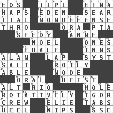 ACROSS 1. Greek goddess of the dawn 4. Native american tent (variation) 8. Inactive volcano in Sicily 12. Atlas contents 14. Locale of original sin 15. Wither 16. Slanted text style (abbr.) 17. Unrelated to defense, as in spending 20. Through, poetically 21. Mouth or opening 22. Parent Teacher Assoc. 23. Full of seeds 27. Queen of England 1702-14 29. Christmas carol 31. Singles 34. Peak District village in England 35. Taverns 36. Actor Alda or Thicke 39. Pet locale 41. System (abbr.) 42. Table seasoning 43. Turbulent 46. Competent 47. Thickened enlargement 48. Of the mouth 51. Robbery 54. The first octave above the treble staff 56. River (Sp.) 58. Undercover agent 61. Producing rotation 66. Russian composer Stravinsky 67. Group working together 68. Writer Wiesel 69. Bar bills 70. Person who is morally reprehensible 71. Pinches, bites 72. Compass dir. DOWN 1. Send forth 2. Pledge 3. Practice fights 4. Nine, plus one 5. Wedding promise 6. Fenced enclosure 7. Southeast Asian peninsula 8. Compass dir. 9. 3-inch nail 10. Political cartoonist Thomas 11. Length times width 13. _ gin 18. Epoch 19. Air blower 24. Conclusion 25. ___ good deed 26. Shout 28. Annoyingly loud 30. Acquire or gain knowledge or skills 32. Followers of ems 33. Fast jet (abbr.) 34. Keyboard key 36. White ___ sheet 37. Experiment locale 38. One to whom something is allotted 40. "Silly old bear" 44. Binary compound 45. Luau accessory 49. Nonscientific branch of learning 50. Cards in a Roman deck? 52. Stricken, poetically 53. Ancient Roman robes 54. Bowlike part 55. Old wives' tales, e.g. 57. Baking chamber 59. Tennis shots 60. Celtic language 62. Leather borer 63. Connecticut Ivy Leaguer 64. Mouth edge 65. It is so