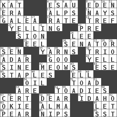 ACROSS 1. Krazy ___ of comics 4. He sold his birthright 8. Paradise 12. Epoch 13. High mountains 14. Negative votes 15. An organ shaped like a helmet 18. Pace 19. Unclean, religiously 20. Crying or shouting loudly 22. Before (prefix) 23. The Jewish people; Israel 24. Area sheltered from the wind 25. Snakelike fish 26. Elected representative 30. Elected rep. 33. Entertaining tales 36. Musical group of three 37. The sixth month of the Jewish calendar 39. Thick or sticky substance 40. Shout 41. Trig term 42. Catcalls? 44. Compass dir. 45. Paper fasteners 47. Pipe bend 50. Lubricate 51. Frog relative 53. "We ___ not amused" (Victoria) 54. Sycophants 57. An absolute certainty 59. Letter starter 61. Potato state 63. Migrant worker of the '30s 64. _ mater 65. Allow 66. Lightbulb-shaped fruit 67. Pinches, bites 68. Fast jet (abbr.) DOWN 1. Barrel 2. Like ___ of sunshine 3. Falsehoods 4. Merit 5. Volcanic refuse 6. Fitting 7. Purpose 8. Plea 9. Have the gumption 10. Sight organ 11. Overdraft (abbr.) 16. Writer Wiesel 17. _ vera 21. In an inward manner 22. Animal enclosure 24. French article 26. Frozen precipitation 27. Relationship diagram 28. Lubricates 29. Hero or heavy, e.g. 30. Backtalk 31. Prepare for publication 32. Nanny 34. Eras 35. Friend of Pooh 38. Newsperson 42. Cartoonist voice _ Blanc 43. Bristle 46. Falsehood 48. Farming town in central California 49. Put down 52. Allots cards 53. Operatic vocal solo 54. Pack (down) 55. Mouths or openings 56. "______ My Girl" (Turtles hit) 57. Police officer (slang) 58. Make supply last 59. Daniel's nick name 60. Biblical high priest 62. Baseball player Mel
