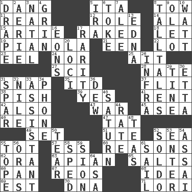 ACROSS 1. Mild oath, euphamism for damn 5. Call ___ day 8. Pull behind 11. Located in or toward the back 12. Hero or heavy, e.g. 14. Insect wing 15. Nick name for Arthur 17. Swept the length of 18. Allow 19. Player piano 21. Car or cant ending 22. Car dealer's back yard 23. Snakelike fish 24. Not either 25. Small island 27. _-fi 28. Nathan's nickname 31. Fastener 35. It would 37. Secret move to avoid paying debts 38. Expression of disdain 39. It is so 41. Monthly bill 42. In addition 43. Armed conflict 45. At sea 46. It's straight from the horse's mouth 47. Make lace 49. Arrange properly for use 51. Shoshoni 52. Ocean 55. Small child 57. Double-curved letter 60. Thinks logically 62. Mouth or opening 63. Bee-related 65. Table seasonings 66. Baking dish 67. Vintage cars 68. The main thing one is thinking about 69. Eastern Standard Time (abbr.) 70. Heredity factor (abbr.) 71. Australian parrot (variant) DOWN 1. Window treatment 2. Nest on high 3. Brizilian seaport 4. Broad smile 5. Retirement account (abbr.) 6. Casino tip 7. Toward shelter 8. Baron Munchausen's specialties 9. Butter sub 10. Electrical Unit 13. Pulitzer Prize-winning author Ferber 16. Immeasurably long periods of time 17. Noteworthy scarcity 20. Locales 26. Kind of red light 29. Prong on a fork 30. Singer James 31. Practice fight 32. The longest river in the world 33. Helper 34. Give a jingle 36. Morning condensation 40. Titan orbits this 44. Pace 48. Afternoon social gatherings 50. Pull into pieces 52. Twentieth part of a lira 53. Keyboard key 54. Slender Brazilian palm 55. Drink excessively 56. Mouths or openings 58. Broke a traffic law 59. The Jewish people; Israel 61. Move on water 64. White ___ sheet