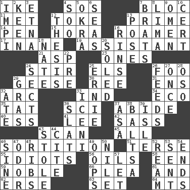 ACROSS 1. Eisenhower's nickname 4. Mayday 7. Group of countries in special alliance 11. Was introduced to 12. Casino tip 13. A-one 14. Animal enclosure 15. Israeli folk dance 16. Wanderer 17. Lacking in sense or substance 19. Aide 21. Viper 23. Singles 24. Move through with a circular motion 25. Raised railways 26. Egg _ yung 29. Honkers 30. Portuguese money of account (variant) 31. Followers of ems 32. Curve 33. Indiana (abbr.) 34. Environmental prefix 35. Make lace 36. _-fi 37. Stay 40. Curvy letter 41. Area sheltered from the wind 42. Backtalk 43. Examine minutely or intensely 45. Everything 46. Casting lots 51. Laconic 55. Foolish or stupid persons 56. Lubricates 58. Car or cant ending 59. Impressive in appearance 60. Entreaty 61. Added to 62. Celtic language 63. Put into a specified state 64. Mountains (abbr.) DOWN 1. Body of Kaffir warriors 2. Peachy ____! 3. Inactive volcano in Sicily 4. "Barney Miller" actor Jack 5. Gumbo ingredient 6. Oceans 7. Naughty children 8. Pale green bean 9. Presage 10. Foregone conclusion 12. College paper 13. Introduce or present, as a question 16. Remove soap 18. Nathan's nickname 20. Having a sole or soles 22. Before (prefix) 24. Religious groups 25. Bert's buddy 26. Gives food to 27. Single time 28. Bear (Spanish) 29. Pate de foie ____ 32. Had dinner 33. Ancient Celtic tribe of eastern Britain 36. Narrow boards 37. White ___ sheet 38. Greek mezzo-soprano Agnes 39. Small island 43. Took without asking 44. Quote 46. Trig term 47. Aroma 48. Teases 49. I made a mistake 50. "Death on the ____" 52. 480, 500 or 516 sheets of paper 53. Posted 54. Conclusions 57. Allow