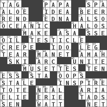 ACROSS 1. Label 4. Dad 8. Health resort 11. _ vera 13. The content of cognition 14. Fermented drink made from hops 15. Tear apart 16. Pulitzer Prize-winning author Ferber 17. In addition 18. Pertaining to the sea 21. Radiant circles of light 22. Cause to be 23. White ___ sheet 25. Compass dir. 26. Lubricate 29. A testis 32. Streamer paper 34. Wedding promise 35. Part of a journey 38. Pull into pieces 39. French painter Edouard 41. Nanny 43. What Jean-Claude Killy likes to do 44. Curve 45. Join together 46. French bagpipes 50. Nine, plus one 51. Curvy letter 54. R.R. building 55. I made a mistake 57. Having lost freshness 59. Stimulate to action 63. Carry 64. Be tempered by heat 67. Operatic vocal solo 68. Writer Wiesel 69. 4th largest of the Great Lakes 70. Small boys 71. Elected rep. 72. Electrical Unit 73. Fish or hair follower DOWN 1. Edible starchy tuberous root 2. Actor Baldwin 3. Went 4. Parts 5. Say or write further 6. Animal enclosure 7. Auto club (abbr.) 8. Makes a sale 9. Mexican monetary units 10. Came up 12. Dutch treat 14. Sound made by sheep 19. Nathan's nickname 20. Mamie's mate 21. Actor Linden 23. Helper 24. Highlander 26. Sep. follower 27. Angers 28. Path through which fluid escapes 30. Colored lightly or faintly 31. Enthusiasm 33. Demure 36. Send forth 37. Yard entry 39. Vertical spar for supporting sails 40. Length times width 42. Layer 45. United States Postal Service (abbr.) 47. Purpose 48. Bathroom plumbing fixture 49. Period of immesurable duration 51. _____ Park, CO 52. Took without asking 53. Smooth fabric 56. Argument over a trivial matter 58. Area sheltered from the wind 60. SW Asia republic 61. Travel on an animal 62. 90 degrees 64. ___ Haven, CT 65. Period 66. Small island