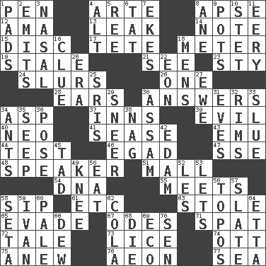 ACROSS 1. Writing instrument 4. Johnson of "Laugh-In" 8. Domed church section 12. Nursemaid (var.) 13. Path through which fluid escapes 14. Brief written record 15. Flat circle 17. Wig 18. Distance measurement 19. Lacking originality or spontaneity 21. Observe 23. Filthy place 24. Runs notes together 26. Single 28. Hearing organs 30. Statements in reply to questions 34. Cleo's killer 37. Taverns 39. Morally bad or wrong 40. Modern: prefix 41. Gospel singer Marvin 43. Australian flightless bird 44. Trial 46. Mild oath 47. Compass dir. 48. Orator 51. Promenade 54. Heredity factor (abbr.) 55. Confronts 58. Small drink 61. And so on (abbr.) 63. Took without asking 65. Dodge 67. Lyric poems 71. Argument over a trivial matter 72. Lie 73. Louse (plural) 74. Baseball player Mel 75. Afresh 76. Period of immesurable duration 77. Ocean DOWN 1. Groovy apts. 2. Sends forth 3. Rhinal 4. Keyboard modifier key 5. To separate or throw off 6. Make lace 7. Supplements with great effort 8. A saturated hydrocarbon 9. Cooking vessels 10. Proofreading order 11. Suggestive of the supernatural 16. A slight indication 18. Not women's 20. Epoch 22. A really long time 25. Indian titles of respect 27. She-sheep 29. Contemptuous expression 30. Indian state 31. Nights before holidays 32. Basketball hoops 33. Turn sharply 34. Pismires 35. Ooze 36. Airs 38. Tired old horse 42. Dutch treat 45. Bit 49. Leg joint 50. Ingest 52. French article 53. Allows 56. Literary convention 57. Chalkboard 58. Bristle 59. _ the terrible 60. Light colored 62. Root beer relative 64. Singer James 66. Morning condensation 68. Expire 69. Environmental prefix 70. Elected rep.
