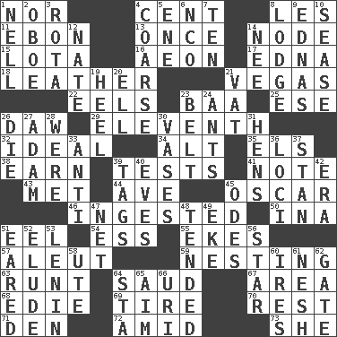 ACROSS 1. Not either 4. Penny 8. French article 11. Inky black, to poets 13. At one time in the past 14. Thickened enlargement 15. Globular water bottle used in Asia 16. Period of immesurable duration 17. Pulitzer Prize-winning author Ferber 18. Cordwainer's material 21. Viva Las _ 22. Snakelike fish 23. Sound made by sheep 25. Compass dir. 26. Simpleton 29. Veterans Day date 32. Standard of perfection 34. Keyboard modifier key 35. Raised railways 38. Merit 39. Trials 41. Make mention of 43. Was introduced to 44. "___ Maria" 45. Witty Wilde 46. Consumed 50. _ tizzy (2 wds.) 51. Snakelike fish 54. Curvy letter 55. Makes supply last 57. Native American of Southwest Alaska 59. Snuggling 63. Undersized animal 64. Saudi Arabian king (1953-1964) 67. Length times width 68. Singer Brickell 69. Become fatigued 70. Relief 71. Lair 72. Among 73. A female animal or person DOWN 1. 1994 drama film starring Jodie Foster 2. Mitch Miller's instrument 3. Roll call or roster of names 4. Unrefined 5. Compass dir. 6. Non-commissioned officer (abbr.) 7. "___ Little Indians" 8. Inn 9. Ferber et al. 10. Gospel singer Marvin 12. Nathan's nickname 14. Born 19. Person who is morally reprehensible 20. Pipe bend 21. Large container 23. Waist strap 24. Pismires 26. Pass on 27. First man 28. Past tense of be (plural) 30. Flower holders 31. Coop moms 33. Against 36. Event scenes 37. Comedian Laurel of Laurel & Hardy 39. Labels 40. Nights before holidays 42. Epoch 45. Lyric poems 47. Remaining after all deductions 48. Looked after 49. Supplement with great effort 51. Having ears or earlike features 52. Dodge 53. Soviet premier 1918-24 56. Play the lead 58. Shoshoni 60. Angers 61. Delicate 62. Yard entry 64. R.R. building 65. Direct toward a target or goal 66. RI univ.