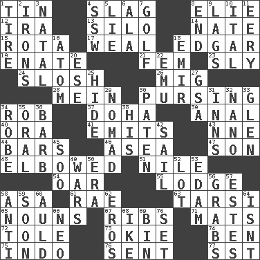 ACROSS 1. Metal container 4. Volcanic refuse 8. Writer Wiesel 12. Lyricist Gershwin 13. Grain storage tower 14. Nathan's nickname 15. Round or rotation of duties 17. Welt 18. _ Allan Poe 19. Maternal 21. Opposite of masc. 23. Insidious 24. Splash clumsily 26. Russian fighter aircraft 28. Count _ (2 wds.) 30. Puckering 34. Director Reiner 37. Capital of the state of Qatar 39. Of or related to the anus 40. Mouth or opening 41. Gives off 43. Compass dir. 44. Long, evenly shaped pieces 46. At sea 47. Male offspring 48. Shoved, as through a crowd 51. Mediterranean tributary 54. Boat paddle 55. Inn 58. White ___ sheet 61. Actress Charlotte 63. Tarsus (plural) 65. Parts of speech 67. Chest bones 71. Floor protectors 72. Lacquered or enameled metalware 73. Migrant worker of the '30s 74. Benjamin's nick name 75. Southeast Asian peninsula 76. Emitted 77. Fast jet (abbr.) DOWN 1. Hoop that covers a wheel 2. Removes the wrinkles 3. Relating to or accompanying birth 4. Compass dir. 5. Untruth 6. Insect wing 7. Eighteen holes 8. Conclude 9. Falls behind 10. Slanted text style (abbr.) 11. Suggestive of the supernatural 16. Smallest unit of an element 18. Independent ruler or chieftain 20. Compass dir. 22. Australian flightless bird 25. Flintstone garb 27. Girls' org. (abbr.) 29. Wanderer 30. Eucharist need 31. Taverns 32. Billionth: prefix 33. Small, secluded valley 34. Loose flowing garment 35. Of the mouth 36. Sharp remark 38. Part of HMS, perhaps 42. Travel by water 45. "Barney Miller" actor Jack 49. Armed conflicts 50. Epoch 52. Car dealer's back yard 53. Dutch treat 56. Seizes 57. _____ Park, CO 58. Against 59. Within a short period 60. Old (Scot.) 62. Greek god of love 64. Is not 66. Modern: prefix 68. Mamie's husband 69. Storage container 70. Arrange properly for use