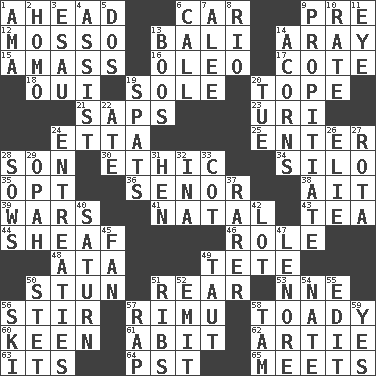 ACROSS 1. At or in the front 6. 4-wheeled motor vehicle 9. Before (prefix) 12. With motion or animation 13. Indonesian resort city 14. Like ___ of sunshine 15. Collect or gather 16. Butter sub 17. ____ d'Azur (French Riviera) 18. Fr. "Yes" 19. Not divided or shared with others 20. Drink excessively 21. Plant excrements 23. RI univ. 24. Singer James 25. Keyboard key 28. Manchild 30. Principle of right and wrong 34. Grain storage tower 35. Choose 36. Sir (Sp.) 38. Small island 39. Armed conflicts 41. Brizilian seaport 43. Beverage made from leaves 44. Bundle of cut stalks of grain 46. Hero or heavy, e.g. 48. "One Day ___ Time" 49. Wig 50. Surprise greatly 51. Located in or toward the back 53. Compass dir. 56. Use a swizzle stick 57. Tall New Zealand timber tree 58. Sycophant 60. Peachy ____! 61. "This won't hurt ____!" 62. Nick name for Arthur 63. It is 64. Pacific Standard Time (abbr.) 65. Confronts DOWN 1. Nursemaid (var.) 2. Like (prefix) 3. Son of Isaac 4. Help 5. Two (Sp.) 6. Give a ring to 7. Toward shelter 8. River (Sp.) 9. Conciliate 10. Assign a rank or rating to 11. Sight organ 13. Expressions of contempt or scorn 14. Oak nuts 19. Arguments over trivial matters 20. Third day of the wk. 22. Had dinner 24. Pleas 26. Writer Wiesel 27. Roll call or roster of names 28. Sty mamas 29. Brightly colored fish 31. Layer 32. _ tizzy (2 wds.) 33. Small bed 37. Less widely known 40. Titan orbits this 42. Car dealer's back yard 45. Avid follower 47. Poe poem 49. Strained 50. Proofreading order 51. Teases 52. Give off 54. Nathan's nickname 55. Prepare for publication 56. What Jean-Claude Killy likes to do 57. Reproach for some lapse or misdeed 58. Scottish cap 59. It is so