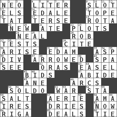 ACROSS 1. Modern: prefix 4. 61 cubic inches 9. Narrow, elongated depression 13. Raised railways 14. Peak District village in England 15. Drink excessively 16. Make lace 17. Laconic 18. Roll call or roster of names 19. ___ Haven, CT 21. Had dinner 22. Secret plans 24. Anneal 26. Director Reiner 27. Trials 29. Quote 30. Originate 31. Dutch treat 33. Viper 36. HTML Container Element 37. Moved like an arrow 40. Health resort 41. Observe 42. Mouths or openings 43. Artist's stand 45. Auction offers 47. Stay 48. One (Scot) 49. Arches 50. Twentieth part of a lira 52. Armed conflict 54. R.R. building 56. Table seasoning 57. Nest on high 59. Nanny (var.) 61. Angers 62. Frees from moisture 63. Immediately 64. Port city in Latvia 65. Allots cards 66. Neckwear DOWN 1. Fish or hair follower 2. Flair 3. Clearly or manifestly demonstrative 4. Allow 5. Perfect 6. Small pie 7. Otherwise 8. To riddle 9. Disco prop 10. Spoils 11. Elects 12. Afternoon social gathering 20. Moistens 22. First class 23. Car dealer's back yard 25. Toward the sea 27. Small amounts or degrees 28. One of the Great Lakes 29. Crow sounds 31. Blunders 32. ___ good deed 33. Helper 34. Hurried 35. Diluted with white 38. Cowboy competition 39. Letter starter 44. Lettered men learn these first 45. Greek mezzo-soprano Agnes 46. Indiana (abbr.) 49. Satellite of Uranus 50. Indian skirt 51. Cassini of fashion 52. Past tense of be (plural) 53. Operatic vocal solo 55. Mine, in Marseilles 56. Title for a knight 57. Find the sum of 58. Curvy letter 60. Deep reverence