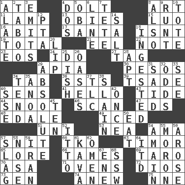 ACROSS 1. Had dinner 4. Stupid person 8. Nonscientific branch of learning 11. Desk light 13. Off-Broadway awards 15. Nilotic language 16. "This won't hurt ____!" 17. Before Barbara or Clara 18. Is not 19. Add up to 21. Snakelike fish 22. Make mention of 23. Greek goddess of the dawn 24. Wedding promise 27. Label 29. Capital of Western Samoa 30. Mexican monetary units 34. Bar bill 36. Fast planes 39. Sadhe (variant) 40. Elected reps. 41. Phone greeting 43. Periodic rise and fall of the sea level 44. Snob 46. Examine hastily 47. Begley and Asner 48. Peak District village in England 49. On the rocks 51. University (slang) 53. Teachers' org. 54. Housemaid (var.) 57. In a ____ (agitated or irritated) 60. Ring climax 63. Southeast Indonesia island 65. Old wives' tales, e.g. 66. Softens 69. Edible starchy tuberous root 70. White ___ sheet 71. Baking chambers 72. "Vaya con ____" 73. Commissioned mil. rank 74. Afresh 75. Compass dir. DOWN 1. Having winglike extensions 2. Off limits 3. Gives off 4. Two (Sp.) 5. Chief or king in Benin or Nigeria 6. Actor's bit 7. Wig 8. In addition 9. Undersized animal 10. Haul 12. Parent Teacher Association (abbr.) 14. Table seasoning 18. Swallowed 20. Mouth edge 25. Food container 26. Fertile tracts in a desert 28. Fitting 29. Utter; complete 31. Stated 32. Probability 33. Observe 34. Be inclined (to) 35. Small Philippine buffalo 37. Affectionate concern, for short 38. Killed 40. Compass dir. 42. At one time in the past 45. Nine, plus one 50. Consume 52. "Tell ____ the Marines!" 54. At full speed 55. Person of subnormal intelligence 56. Came up 57. Volcanic refuse 58. Characteristic smell of wine 59. SW Asia republic 61. Polynesian shrub of the pepper family 62. Sign of things to come 64. It would 67. Compass dir. 68. Compass dir.
