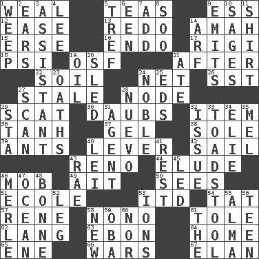 ACROSS 1. Welt 5. Beverages made from leaves 9. Curvy letter 12. Relaxation 13. Redecorate 14. Nanny 15. Celtic language 16. Inside; within (prefix) 17. Swiss mountan, "Queen of the Mountains" 18. 23rd letter of the Greek alphabet 19. Order of Saint Francis (abbr.) 21. Following 22. The visible part of the earth's surface 24. Remaining after all deductions 26. Fast jet (abbr.) 27. Having lost freshness 28. Thickened enlargement 29. Go away! 30. Applies to a surface 32. Detail 36. Hyperbolic tangent 37. Set 38. Flatfish 39. Pismires 40. Prying instrument 42. Travel by water 43. Former U.S. Attorney General Janet 44. Dodge 46. Disorderly crowd 49. Small island 50. Observes 51. Learning spot: Fr. 53. It would 54. Make lace 57. French philosopher Descartes 58. Words to Nanette 61. Lacquered or enameled metalware 62. Austrian-born American filmmaker Fritz 63. Inky black, to poets 64. Dwelling 65. Compass dir. 66. Armed conflicts 67. Flair DOWN 1. Shed a tear 2. Hearing organs 3. Aide 4. Area sheltered from the wind 5. Unclean, religiously 6. Car or cant ending 7. Increase 8. "Barney Miller" actor Jack 9. Gives off 10. Gurus 11. Upper-body garment 14. Sandy's bark 19. Lubricate 20. Downhill vehicle 21. Had dinner 23. Expletives 24. Impressive in appearance 25. Begley and Asner 27. Examine hastily 28. New (sp.) 29. R.R. building 31. Representative 32. Come out of 33. Inedible or poisonous agaric 34. Writer Wiesel 35. Cartoonist voice _ Blanc 40. Flowery wreath 41. State of inaction 43. Actress Charlotte 45. Directed 46. Haggard of country music 47. Sea 48. Maid-servant 52. Part of a journey 53. Charged particles 55. _ mater 56. Adolescent 58. ___ Haven, CT 59. Chief or king in Benin or Nigeria 60. And not 61. Definite Article