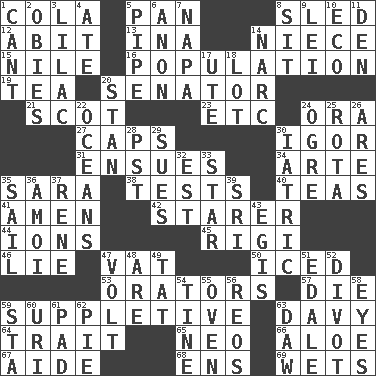 ACROSS 1. Root beer relative 5. Baking dish 8. Downhill vehicle 12. "This won't hurt ____!" 13. _ tizzy (2 wds.) 14. Sibling's daughter 15. Mediterranean tributary 16. Census information 19. Afternoon social gathering 20. Legislator 21. Native of Scotland 23. And so on (abbr.) 24. Mouth or opening 27. Balmoral and tarboosh 30. Russian composer Stravinsky 31. Takes place subsequently 34. Johnson of "Laugh-In" 35. "Two Mules for Sister ____" 38. Trials 40. Afternoon social gatherings 41. So be it 42. A viewer who gazes fixedly 44. Charged atoms 45. Swiss mountan, "Queen of the Mountains" 46. Whopper 47. Large container 50. On the rocks 53. Speakers 57. Expire 59. Supplying deficiencies 63. _ Jones' Locker 64. Distinguishing feature 65. Modern: prefix 66. _ vera 67. Helper 68. Followers of ems 69. Soaks DOWN 1. Patter 2. Off-Broadway awards 3. Pale purple color 4. Had dinner 5. Corncob 6. At once, immediately (arch.) 7. California wine valley 8. Be seated 9. Flowery wreath 10. Environmental prefix 11. Lair 14. Drug cop 17. Shoshoni 18. Car dealer's back yard 20. Comedian Laurel of Laurel & Hardy 22. Seas 24. Legendary monster 25. Roll call or roster of names 26. Ancient Greek god of war 28. Pacific Standard Time (abbr.) 29. Institutes legal proceedings 30. Of or pertaining to medicine 32. Eastern Standard Time (abbr.) 33. Play the lead 35. Travel by water 36. Mine, in Marseilles 37. French philosopher Descartes 39. _ Lanka 43. Armor plate that protects the chest 47. Electrical Unit 48. "We ___ not amused" (Victoria) 49. Make lace 51. Peak District village in England 52. A piece of turf (Scot.) 54. Prong on a fork 55. Baking chamber 56. Vintage cars 58. Sight organs 59. R.R. building 60. RI univ. 61. Groovy apt. 62. Sliced dessert 63. Simpleton