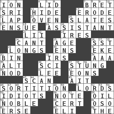ACROSS 1. Electrically charged atom 4. Hat (slang) 7. Cy Young winner Saberhagen 11. Indian title of respect (Mr.) 12. Flintstone garb 13. Wear away 14. Infant locale 15. Baking chamber 16. Chalkboards 17. Take place subsequently 19. Helper 21. Cards in a Roman deck? 23. Angers 24. Patter 25. Personal question 26. Fast jet (abbr.) 29. Yearns 30. Followers of ems 31. Supplement with great effort 32. Storage container 33. Big collection agency 34. American Automobile Association (abbr.) 35. Keyboard modifier key 36. _-fi 37. Feeling sharp psychological pain 40. Lower and raise head in agreement 41. Area sheltered from the wind 42. Immeasurably long periods of time 43. Skim 45. Small island 46. Casting lots 51. Titled peers of a realm 55. Foolish or stupid persons 56. Make mention of 58. Petroleum 59. Having high moral qualities 60. An absolute certainty 61. Bear (Spanish) 62. Celtic language 63. Connecticut Ivy Leaguer 64. Definite Article DOWN 1. Small island 2. Northwest Algerian city 3. Cuts off 4. 54 in ancient Rome 5. The content of cognition 6. Cub Scout units 7. Naughty children 8. Roll call or roster of names 9. Paradise 10. Trial 12. Weeding 13. Otherwise 16. Begets 18. ____ Bator 20. Public displays of written messages 22. ___ a Wonderful Life 24. Continued (abbr.) 25. Nest on high 26. Actors Connery and Penn 27. Heroin 28. Afternoon social gathering 29. _ and Stitch 32. Forbid 33. Ancient Celtic tribe of eastern Britain 36. Narrow boards 37. Ocean 38. Bathroom plumbing fixture 39. To (old English) 43. Fur scarf 44. Quote 46. Trig term 47. Scent 48. Chest bones 49. Single time 50. Christmas carol 52. Carrot, for example 53. Food container 54. A type of plum 57. Three (prefix)