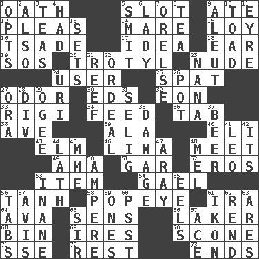 ACROSS 1. Pledge 5. Narrow opening 9. Had dinner 12. Entreaties 14. Female horse 15. Myrna of the movies 16. Sadhe (variant) 17. It may be bright or harebrained 18. Hearing organ 19. Distress signal 20. TNT 23. Naked 24. One who uses or employs something 25. Argument over a trivial matter 27. Scent 30. Begley and Asner 32. Period of immesurable duration 33. Swiss mountan, "Queen of the Mountains" 34. Nourish 36. Bar bill 38. "___ Maria" 39. According to 40. Biblical high priest 43. Shade tree 46. Pale green bean 48. Confront 49. Nanny (var.) 51. Slender fish 52. Greek god of love 53. A distinct part 54. Highlander 56. Hyperbolic tangent 58. Wimpy's pal 61. Lyricist Gershwin 64. Actress Gardner 65. Elected reps. 66. Member of a famous L.A. basketball team 68. Storage container 69. Angers 70. Biscuitlike quick bread 71. Compass dir. 72. Remainder 73. Extremities DOWN 1. Elects 2. In addition 3. Beverages made from leaves 4. Possessed 5. Stricken, poetically 6. Kenny Rogers chart-topper in '80 7. Threatening words 8. Beverage made from leaves 9. Native American of Southwest Alaska 10. Frog relative 11. Jane of fiction 13. Arranges properly for use 21. Coral collection 22. Severe or trying experience 23. Grandmother 24. RI univ. 26. Plant holder 27. Mouth or opening 28. HTML Container Element 29. Double curve, resembling the letter S 31. Former Milwaukee Brewers owner Bud 35. Break 37. Fermented drink made from hops 41. Lion 42. It is 44. Thin strip of wood or metal 45. Madame (abbr.) 47. Like ___ of sunshine 48. Cartoonist voice _ Blanc 50. Electrical Unit 53. Empty; void 55. Snakelike fish 56. Bar bills 57. Opinion 59. Washington bills 60. Inconspicuous attention getter 61. Visual representation of an object 62. Tear apart 63. Ancient Greek god of war 65. Title for a knight 67. Adept person