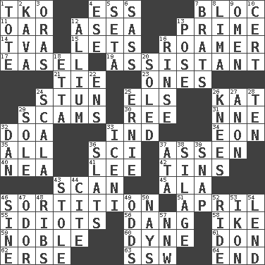 ACROSS 1. Ring climax 4. Curvy letter 7. Group of countries in special alliance 11. Boat paddle 12. At sea 13. A-one 14. Federal power corp. 15. Allows 16. Nomad 17. Artist's stand 19. Helper 21. Neckwear 23. Washington bills 24. Make senseless or dizzy 25. Raised railways 26. Krazy ___ of comics 29. Fraudulent business schemes 30. To separate or throw off 31. Compass dir. 32. ___ good deed 33. Indiana (abbr.) 34. Period of immesurable duration 35. Everything 36. _-fi 37. NE Netherlands city 40. Teachers' org. 41. Area sheltered from the wind 42. Canisters 43. Glance over 45. Wing 46. Decision 51. Showery time 55. Foolish or stupid persons 56. Mild oath, euphamism for damn 58. Mamie's mate 59. Impressive in appearance 60. Unit of force 61. Spanish title 62. Celtic language 63. Compass dir. 64. Conclusion DOWN 1. Carry 2. Polynesian shrub of the pepper family 3. Mouths or openings 4. Compass dir. 5. Bristle 6. Backtalk 7. Naughty children 8. Pale green bean 9. Sign of something about to happen 10. Certainty 12. Plant genus of onion and garlic 13. Airs 16. Remove soap 18. Singer James 20. Having a sole or soles 22. Followers of ems 24. Any of the three canals of the cochlea 25. Bert's buddy 26. Leg joints 27. Soon (poet.) 28. "___ Little Indians" 29. Flatfish 32. One of the 12 tribes of Israel 33. Ancient Celtic tribe of eastern Britain 36. Narrow boards 37. "One Day ___ Time" 38. Fodder prepared in a silo 39. Fastener 43. Fur scarf 44. Quote 46. Trig term 47. Aroma 48. Chest bones 49. Probability 50. Negative votes 52. Travel on or in a vehicle 53. Image 54. Grant temporary use of 57. Compass dir.