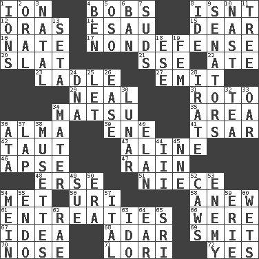 ACROSS 1. Electrically charged atom 4. Moves up and down 8. Is not 12. Mouths or openings 14. He sold his birthright 15. Letter starter 16. Nathan's nickname 17. Unrelated to defense, as in spending 20. Narrow board 21. Compass dir. 22. Had dinner 23. Dipping utensil 27. Send forth 29. Anneal 31. Printing process, for short 34. Taiwanese island in East China Sea 35. Length times width 36. _ mater 39. Compass dir. 41. Russian ruler of old 42. Strained 43. Place in a line 46. Domed church section 47. Water falling in drops from the sky 48. Celtic language 51. Sibling's daughter 54. Was introduced to 56. RI univ. 58. Afresh 61. Pleas 66. We are 67. It may be bright or harebrained 68. The sixth month of the Jewish calendar 69. Stricken, poetically 70. Sense of smell 71. Australian parrot (variant) 72. Affirmative reply DOWN 1. Charged atoms 2. Of the mouth 3. Relating to or accompanying birth 4. Benjamin's nick name 5. Bear (Spanish) 6. Bar 7. Beer foam 8. Binary compound 9. Legislators 10. Political cartoonist Thomas 11. Family _ (genealogy) 13. Stalk of a moss capsule 18. Compass dir. 19. Opposite of masc. 24. Heredity factor (abbr.) 25. Allow 26. Relaxation 28. Feeling or showing extreme anger 30. Type of eclipse 32. Afternoon social gathering 33. Boat paddle 34. Mother 36. _ moment's notice (2 wds.) 37. Infant locale 38. French bagpipes 40. Enthusiasm 44. One more than two 45. Compass dir. 49. Take to court 50. Period 52. Crow sounds 53. Foe 54. Chow _ 55. Inside; within (prefix) 57. Slanted text style (abbr.) 59. One of the Great Lakes 60. Moistens 62. Actress Charlotte 63. Wedding promise 64. Ewer handle 65. _ Lanka