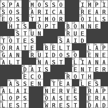 ACROSS 1. Health resort 4. With motion or animation 9. Body of Kaffir warriors 13. Mayday 14. N. Chile seaport 15. Stern 16. Greek goddess of the dawn 17. The easternmost of the Lesser Sundas 18. Lubricates 19. Part of HMS, perhaps 21. Choose 22. Maid-servant 24. Surprise greatly 26. Regret 27. Lugs 29. Alleged 30. Declaim 31. Waist strap 33. Pet locale 36. Separate the seeds from cotton 37. Boisterous (Brazilian Portuguese) 40. Compass dir. 41. Keyboard modifier key 42. Political cartoonist Thomas 43. Climbing, woody, usually tropical vines 45. Raised platform 47. Keyboard key 48. Environmental prefix 49. Writer of Portnoy's Complaint (1969) 50. NE Netherlands city 52. Afternoon social gathering 54. French article 56. Mountain range southwest of Kyrgyzstan 57. Boldness 59. Hit sharply and swiftly 61. Chops off 62. Fertile tracts in a desert 63. Period 64. For fear that 65. Take or capture by force 66. Male parent DOWN 1. Compass dir. 2. "Silly old bear" 3. Helper 4. Floor covering 5. Greek mythologigal hunter 6. Simple or foolish person 7. Native of Scotland 8. Rowing implement 9. Pressed 10. Chow _ 11. Diluted with white 12. Big collection agency 20. Proofreading order 22. Naughty children 23. Fr. "Yes" 25. One who uses or employs something 27. Ancient Roman robe 28. Of the mouth 29. Notch 31. Prejudice 32. Begley and Asner 33. Tough but pliablecoriaceous 34. Queen of England 1702-14 35. Lightbulb-shaped fruit 38. The state of being joined or united 39. Margarine 44. International (abbr.) 45. Stop 46. Adept person 49. All-night dance parties 50. Medicinal plant 51. Plant excrements 52. Lacerate 53. Celtic language 55. "Two Mules for Sister ____" 56. 100% 57. At this time 58. Eastern Standard Time (abbr.) 60. Writing tablet