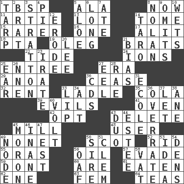 ACROSS 1. Cook's measure (abbr.) 5. Wing 8. Immediately 11. Nick name for Arthur 13. Car dealer's back yard 14. Heavy book 15. More uncommon 16. Single 17. Set down 18. Parent Teacher Association (abbr.) 19. Cassini of fashion 21. Naughty children 22. Event that recurs at intervals 24. Charged atoms 25. Main course 27. Epoch 29. Small Philippine buffalo 30. Desist 32. Monthly bill 33. Dipping utensil 35. Root beer relative 39. Vices 41. Baking chamber 42. Choose 43. Erase 45. Place where flour is made 48. One who uses or employs something 49. Music written for nine 50. Native of Scotland 52. To free from 55. Mouths or openings 56. Petroleum 57. Elude 59. Do not 60. "We ___ not amused" (Victoria) 61. Consumed 62. Compass dir. 63. Opposite of masc. 64. Afternoon social gatherings DOWN 1. Canvas cover 2. Naughty child 3. Ski resort town in Vermont 4. Sliced dessert 5. Medicinal plant 6. Having great length 7. Had dinner 8. Pitcher Ryan 9. Leaves out 10. Soaks 12. Wear away 14. Pacific island yam 20. Area sheltered from the wind 21. Prejudice 23. Feeling or showing extreme anger 25. Hearing organ 26. Compass dir. 27. Snakelike fish 28. Actress Charlotte 30. Music discs 31. Learning spot: Fr. 33. Mouth edge 34. The first octave above the treble staff 36. Make much ado about nothing 37. Allow 38. A saturated hydrocarbon 40. Electrical Unit 43. Superhero pair 44. First name in cosmetics 45. Person of subnormal intelligence 46. Silly 47. For fear that 49. Connecting point 50. Title for a man of rank and authority 51. Clement's nick name 53. The content of cognition 54. Habitations of wild animals 56. Clumsy lout 58. Large container