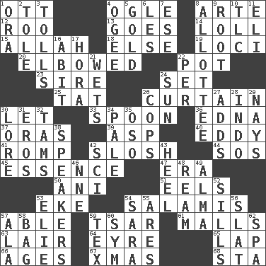 ACROSS 1. Baseball player Mel 4. Stare 8. Johnson of "Laugh-In" 12. Friend of Pooh 13. Leaves 14. Hang loosely or laxly 15. Assad's deity 18. Otherwise 19. Locales 20. Turned at an angle; bent 22. Plant holder 23. Beget 24. Put into a specified state 25. Make lace 26. Window treatment 30. Allow 33. Soup utensil 36. Pulitzer Prize-winning author Ferber 37. Mouths or openings 39. Cleo's killer 40. Whirlpool 41. Play 42. Agitate, as a liquid 44. Distress signal 45. Gist 47. Epoch 50. Black tropical American cuckoo 51. Snakelike fish 53. Supplement with great effort 54. Deli grouping 57. Competent 59. Russian ruler of old 61. Shopping centers 63. Den 64. Jane of fiction 65. Pet locale 66. Eras 67. Dec. holiday 68. R.R. building DOWN 1. Mouth or opening 2. Lacquered or enameled metalware 3. For Whom the Bell _____ 4. Double curve, resembling the letter S 5. Gilded 6. French article 7. Compass dir. 8. One to whom something is allotted 9. Carrot, for example 10. Affectionate concern, for short 11. Connecticut Ivy Leaguer 16. "This won't hurt ____!" 17. Israeli folk dance 21. Soaks 22. For each 24. Player for Phoenix 26. 911 reaches them 27. Sums up 28. Southeast Asian peninsula 29. Negative votes 30. Old wives' tales, e.g. 31. Greek god of love 32. Scottish caps 34. Light colored 35. Bear (Spanish) 38. Orators 42. _-fi 43. Person who is morally reprehensible 46. Compass dir. 48. 480, 500 or 516 sheets of paper 49. _ mater 52. Beverly of Met fame 53. Writer Wiesel 54. "Two Mules for Sister ____" 55. Ancient Greek god of war 56. Narrow board 57. Insect wing 58. Container for groceries 59. John Ritter's dad 60. Symbol (abbr.) 62. Health resort