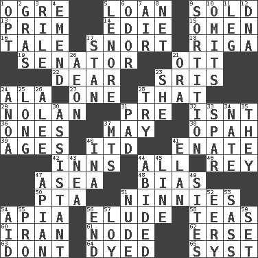 ACROSS 1. Legendary monster 5. Grant temporary use of 9. Exchanged or delivered for money 13. Demure 14. Singer Brickell 15. Presage 16. Falsehood 17. Derisive sound 18. Capital of Latvia 19. Elected representative 21. Baseball player Mel 22. Letter starter 23. Indian titles of respect 24. In the manner of 27. Single 28. Not this but _ 29. Pitcher Ryan 31. Before (prefix) 32. Is not 36. Singles 37. Can I? 38. Brightly colored fish 39. Eons 40. It would 41. Related on the mother's side 42. Restaurants 44. Everything 46. Marina Del _, California 47. At sea 48. Prejudice 50. Parent Teacher Association (abbr.) 51. Fools 54. Capital of Western Samoa 56. Dodge 58. Beverages made from leaves 60. SW Asia republic 61. Thickened enlargement 62. Celtic language 63. Do not 64. Colored 65. System (abbr.) DOWN 1. Elect 2. Pate de foie ____ 3. Cause heat under the collar 4. Make improvements or corrections to 5. Poe poem 6. Scent 7. Atmosphere 8. Remaining after all deductions 9. Determination 10. Leaves out 11. Part of a journey 12. Heredity factor (abbr.) 17. Comedian Laurel of Laurel & Hardy 20. Period of immesurable duration 21. Mouth or opening 23. A female animal or person 24. Small Philippine buffalo 25. Having great length 26. Toward shelter 28. Attempt 30. Helper 31. Writing tablet 33. Practice fight 34. Nathan's nickname 35. Those people 37. Mountains (abbr.) 40. _ tizzy (2 wds.) 41. Liveliness 43. Teachers' org. 44. Tolerated 45. Actor's bit 47. Bee-related 49. Settings 51. Naked 52. Suggestive of the supernatural 53. Backtalk 54. Help 55. Adept person 56. Conclude 57. Myrna of the movies 59. Put into a specified state