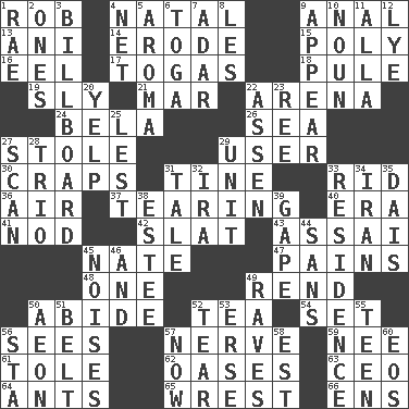 ACROSS 1. Director Reiner 4. Brizilian seaport 9. Of or related to the anus 13. Cuckoo 14. Wear away 15. Much (prefix) 16. Snakelike fish 17. Ancient Roman robes 18. Whine 19. Cunning 21. Third mo. 22. Sports stadium 24. Actor Lugosi 26. Ocean 27. Fur scarf 29. One who makes use of a thing 30. Dice game 31. Prong on a fork 33. To free from 36. Wind 37. Pulling apart 40. Period 41. Lower and raise head in agreement 42. Narrow board 43. Slender Brazilian palm 45. Nathan's nickname 47. Aches 48. Single 49. Tear apart 50. Tolerate 52. Beverage made from leaves 54. Put into a specified state 56. Perceives with the eye 57. Boldness 59. Born 61. Lacquered or enameled metalware 62. Fertile tracts in a desert 63. Corporate head (abbr.) 64. Pismires 65. Obtain by seizing forcibly or violently 66. Followers of ems DOWN 1. Actress Charlotte 2. Washington bills 3. Big road sign 4. Remaining after all deductions 5. Scent 6. Ancient Roman robe 7. The sixth month of the Jewish calendar 8. French article 9. Seem 10. Part of speech 11. Silent film actress Nazimova 12. Potassium hydroxide 20. Sharp bark 22. NE Netherlands city 23. To separate or throw off 25. For fear that 27. Examine hastily 28. Musical group of three 29. A single undivided whole 31. Story 32. Retirement account (abbr.) 33. Dwelling 34. SW Asia republic 35. Raised platform 38. First name in cosmetics 39. Stare wonderingly 44. Without 45. Annoying sounds 46. Added to 49. All-night dance parties 50. A really long time 51. Waist strap 52. Lacerate 53. Celtic language 55. Adolescent 56. R.R. building 57. At this time 58. Eastern Standard Time (abbr.) 60. Greek goddess of the dawn