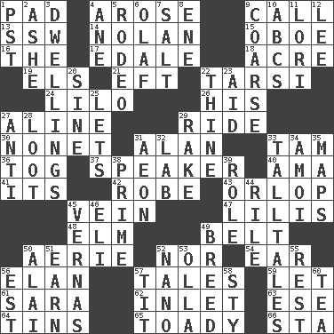 ACROSS 1. Groovy apt. 4. Came up 9. Give a ring to 13. Compass dir. 14. Pitcher Ryan 15. Mitch Miller's instrument 16. Definite Article 17. Peak District village in England 18. 1/640 square mile 19. Raised railways 21. Lizard (obsolete) 22. Tarsus (plural) 24. _ and Stitch 26. Part of HMS, perhaps 27. Place in a line 29. Travel on an animal 30. Music written for nine 31. Actor Alda or Thicke 33. Scottish cap 36. Coat; cloak 37. Orator 40. Wet nurse (var.) 41. ___ a Wonderful Life 42. Loose flowing garment 43. Fourth or lowest deck 45. Distinctive style or manner 47. Ms. Damita and namesakes 48. Shade tree 49. Waist strap 50. Nest on high 52. Not either 54. Ewer handle 56. Style 57. Stories 59. Allow 61. "Two Mules for Sister ____" 62. An arm off of a larger body of water 63. Compass dir. 64. Metal containers 65. Sycophant 66. R.R. building DOWN 1. Pacific Standard Time (abbr.) 2. American tennis player Robert 3. Residences 4. One (Scot) 5. Cowboy competition 6. Norwegian king 7. Table seasoning 8. Compass dir. 9. Rough 10. Lettered men learn these first 11. Australian parrot (variant) 12. Area sheltered from the wind 20. Trig term 22. One or ones belonging to thee 23. Help 25. Allows 27. Against 28. Spoils 29. Libertine 31. Period of immesurable duration 32. Experiment locale 33. Baron Munchausen's specialties 34. Mine, in Marseilles 35. Atlas contents 38. A-one 39. Hero or heavy, e.g. 44. Cause heat under the collar 45. Actresses Bloom and Felton 46. Connecticut Ivy Leaguer 49. A special lineage 50. Jai _ 51. Merit 52. Billionth: prefix 53. Spanish pot 55. Respite 56. Eastern Standard Time (abbr.) 57. Teat (slang) 58. Filthy place 60. Afternoon social gathering