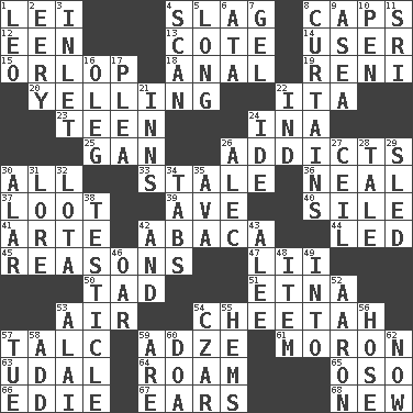 ACROSS 1. Luau accessory 4. Volcanic refuse 8. Balmoral and tarboosh 12. Car or cant ending 13. ____ d'Azur (French Riviera) 14. One who uses or employs something 15. Lowest deck of a ship 18. Of or related to the anus 19. Painter Guido (1575-1642) 20. Crying or shouting loudly 22. Call ___ day 23. Adolescent 24. _ tizzy (2 wds.) 25. Separate the seeds from cotton 26. Inveterate users 30. 100% 33. Having lost freshness 36. Be tempered by heat 37. Plunder 39. "___ Maria" 40. Filth; sediment 41. Johnson of "Laugh-In" 42. Phillipine bananalike plant 44. Directed 45. Thinks logically 47. Cards in a Roman deck? 50. Bit 51. Inactive volcano in Sicily 53. Atmosphere 54. Leopard's kin 57. Baby powder 59. Axlike tool, used for shaping wood 61. Person of subnormal intelligence 63. Hereditary estate 64. Wander 65. Bear (Spanish) 66. Singer Brickell 67. Hearing organs 68. ___ Haven, CT DOWN 1. Lion 2. Suggestive of the supernatural 3. An arm off of a larger body of water 4. Skim 5. Yearn 6. "One Day ___ Time" 7. Set 8. Window treatments 9. At sea 10. Fenced enclosure 11. Indian title of respect (Mr.) 16. Cassini of fashion 17. Entreaty 21. Taverns 22. Working for oneself (abbr.) 24. Binary compound 26. Actor Baldwin 27. To provide with a ceiling 28. Story 29. Downhill vehicle 30. Having or resembling wings 31. Old wives' tales, e.g. 32. Globular water bottle used in Asia 34. Bar bills 35. Actress Gardner 38. A testis 42. Added to 43. Toward shelter 46. Rowing implement 48. A distinct part 49. To the inside or interior of 52. Composer Copland 53. Jai _ 54. Russian ruler of old 55. Folds over and sews together 56. Flexible conduit 57. Third day of the wk. 58. Find the sum of 59. "We ___ not amused" (Victoria) 60. ___ good deed 62. At this time