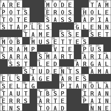 ACROSS 1. "We ___ not amused" (Victoria) 4. Method 8. Scottish cap 11. Cooking vessels 13. Greek god of love 14. Hollow 15. Carryall 16. Backtalk 17. Capital of Western Samoa 18. Paper fasteners 21. American astronaut and politician John 22. Not wild 23. Compass dir. 25. Arrange properly for use 26. Crowd into 29. French bagpipes 32. _____ steamer (cargo ship) 34. Compete 35. Product of festering 38. "Two Mules for Sister ____" 39. Don Adams' spy role 41. Operatic vocal solo 43. Fast jet (abbr.) 44. Directed 45. Therefore, facetiously 46. SAT takers 50. Nursemaid (var.) 51. Raised railways 54. Ripen 55. Ancient Greek god of war 57. Former Milwaukee Brewers owner Bud 59. Player piano 63. Tense 64. Cook's measure (abbr.) 67. SW Asia republic 68. Blunders 69. Johnson of "Laugh-In" 70. Ache 71. Followers of ems 72. Frog relative 73. Compass dir. DOWN 1. Tenement units (abbr.) 2. Carrot, for example 3. Singer James 4. Makes clutter 5. Mouth or opening 6. Two (Sp.) 7. Curvy letter 8. Drinks excessively 9. Place in a line 10. Intended 12. Back-to-school mo. 14. Actor Linden 19. Desk light 20. Australian flightless bird 21. Unit of force equal to gravity 23. Commotion 24. Proofreading order 26. Mountains (abbr.) 27. Mouths or openings 28. Long, evenly shaped pieces 30. Elude 31. Practice fight 33. Floor coverings 36. Capital and largest city of Mongolia 37. Thailand, formerly 39. Snaillike creature with no shell 40. Ancient Persian 42. Chicken ___ king 45. Toward the sea 47. Label 48. Slept 49. Three (prefix) 51. First name in cosmetics 52. Memorize 53. Disparaging remarks 56. Sever or remove by pinching or nipping 58. ___ a Wonderful Life 60. Northwest Algerian city 61. (Had) reclined 62. Queen of England 1702-14 64. Make lace 65. Sis' sibling 66. R.R. building