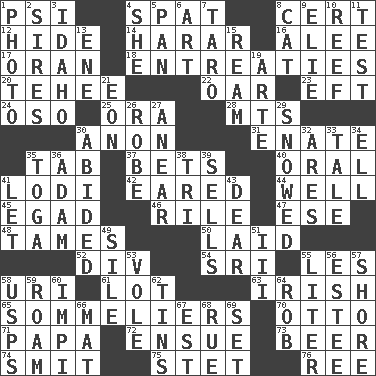 ACROSS 1. Air pressure measure (abbr.) 4. Petty quarrel 8. Certainty 12. Flintstone garb 14. Ethiopian city, capital of Harari 16. Toward shelter 17. Northwest Algerian city 18. Pleas 20. Giggle 22. Rowing implement 23. Newt 24. Bear (Spanish) 25. Mouth or opening 28. Mountains (abbr.) 30. Soon (poet.) 31. Related on the mother's side 35. Bar bill 37. Antes 40. Taken by mouth 41. Farming town in central California 42. Having ears or earlike features 44. Water source 45. Mild oath 46. Cause heat under the collar 47. Compass dir. 48. Softens 50. Put down 52. HTML Container Element 54. _ Lanka 55. French article 58. RI univ. 61. Car dealer's back yard 63. From or relating to Ireland 65. Wine waiters 70. "Beetle Bailey" pooch 71. Dad 72. Follow as a consequence or result 73. Fermented drink made from hops 74. Stricken, poetically 75. Proofreading order 76. To riddle DOWN 1. Picture 2. Begets 3. Potato state 4. A female animal or person 5. Baking dish 6. Nonscientific branch of learning 7. Pacific island yam 8. Feline 9. Writer Wiesel 10. Coral collection 11. Trial 13. Compass dir. 15. 480, 500 or 516 sheets of paper 19. Johnson of "Laugh-In" 21. A really long time 26. Loose flowing garment 27. Approach 29. Overwhelmed 30. Remained 32. Ancient Greek god of war 33. Story 34. Pipe bend 35. Ancient Roman robe 36. First man 38. Three (prefix) 39. Exchanges for money 41. Allow 43. Letter starter 49. Drop; flow; fall 51. One more than two 53. Short-tailed, large-bodied rat 55. 61 cubic inches 56. First name in cosmetics 57. Dinah or Pauly 58. United States Postal Service (abbr.) 59. Wander 60. Body of Kaffir warriors 62. Metal containers 64. Director Reiner 66. Floor covering 67. Eastern Standard Time (abbr.) 68. Regret 69. Put into a specified state